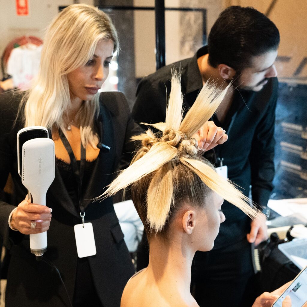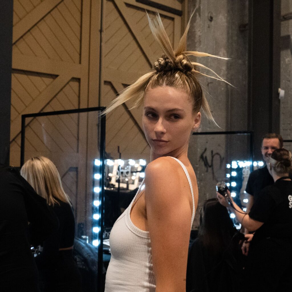 No stranger to fashion weeks around the world, the spiky bun was again featured at AAFW ’23 at Yousek Akbar. GHD Hair Director Mary Alamine is responsible for the style, which she says starts with damp hair and a volumising foam (she uses ghd body goals).
