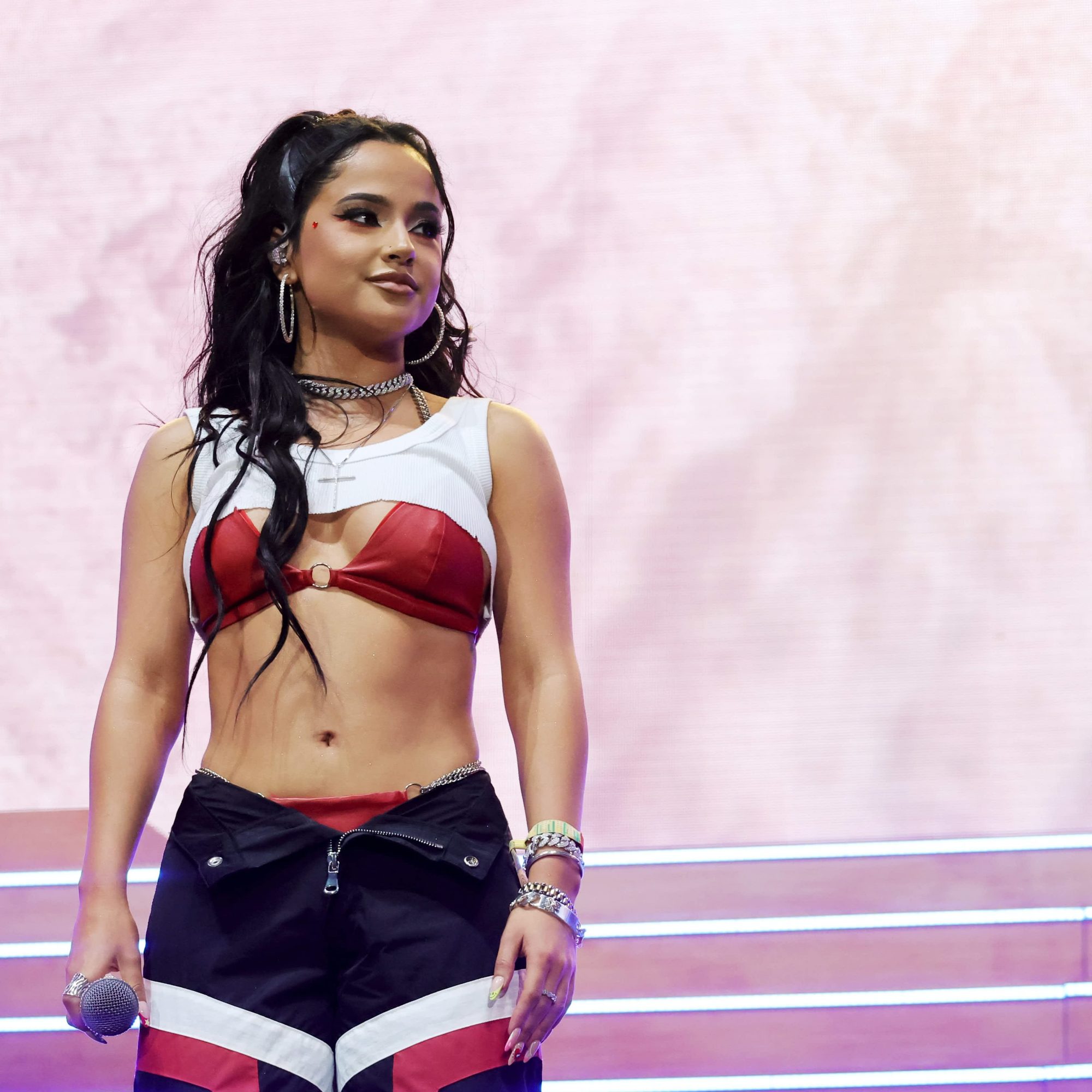 Becky G hit the stage at Coachella on April 17 with a Y2K-inspired beauty look. The singer wore a half-up, half-down hairstyle with loose, tousled waves; brown lipstick (presumably from her brand, Treslúce Beauty); a red heart face gem; and mismatched nails that looked like they were plucked straight from our summer mood boards.