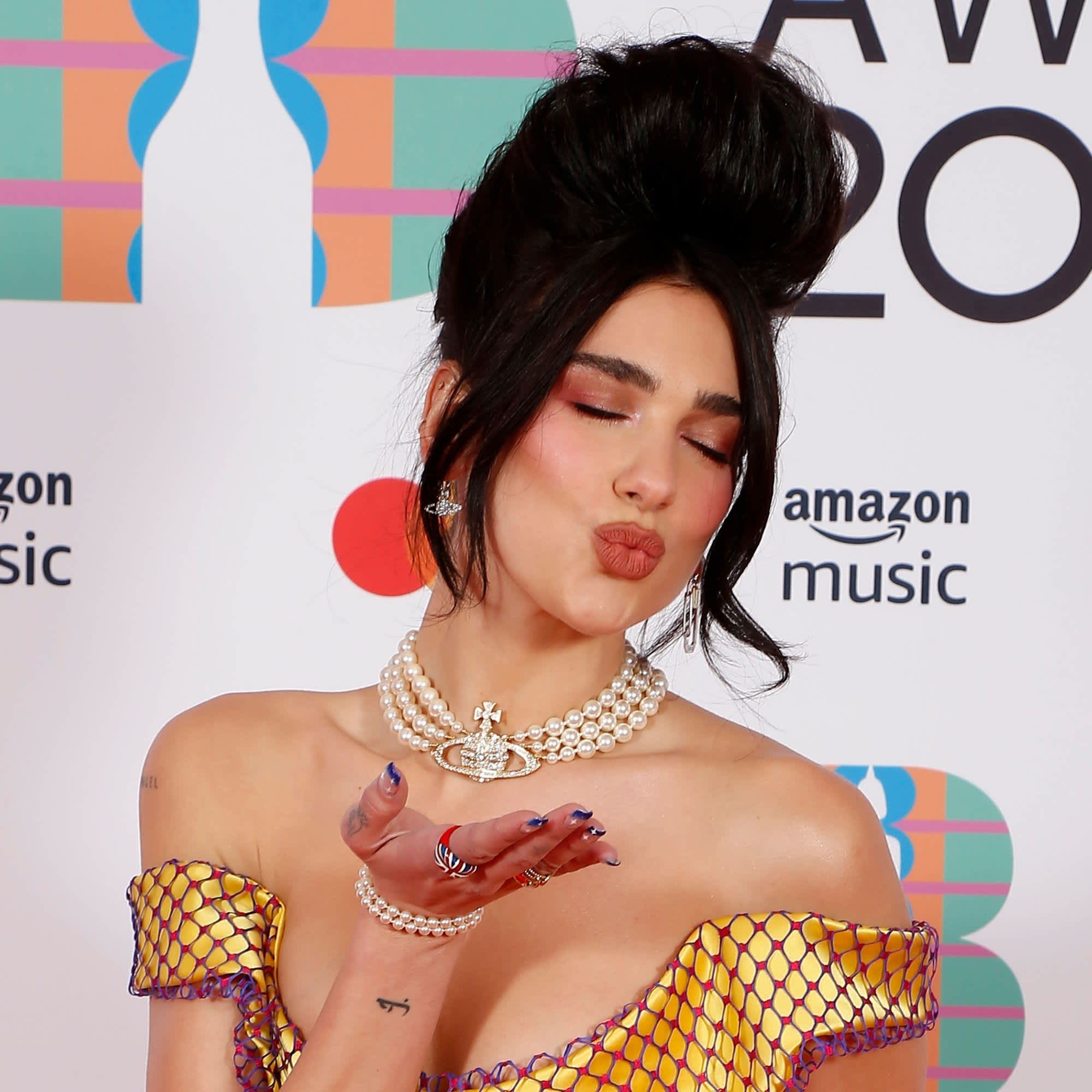 Dua Lipa paired her statement beehive with a golden yellow Vivienne Westwood mini dress at the 2021 BRIT Awards. “I wanted to make it British, quite London, have some fun with it,” Lipa said of her look.