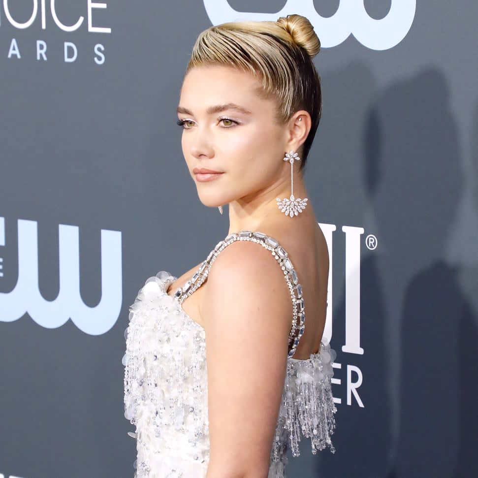 Little Women actress Florence Pugh dazzled the Critics’ Choice Awards in a shimmering Prada gown with a slicked-back, wet updo by hairstylist Peter Lux.