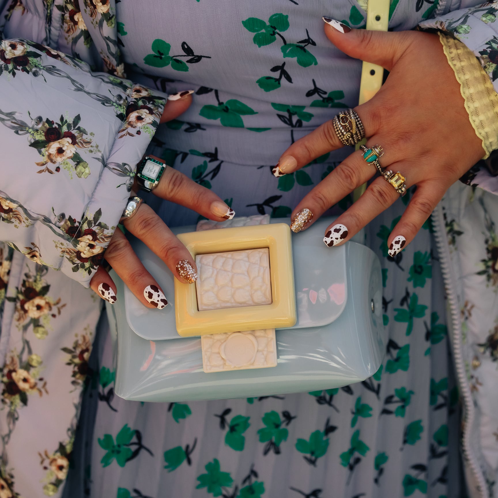 Whether it fits your taste for home decor or clothing, you can’t deny that cow-print nails are back. This Y2K-inspired pattern saw a major resurgence at NYFW and is the perfect way to subtly mix prints without being overwhelming.