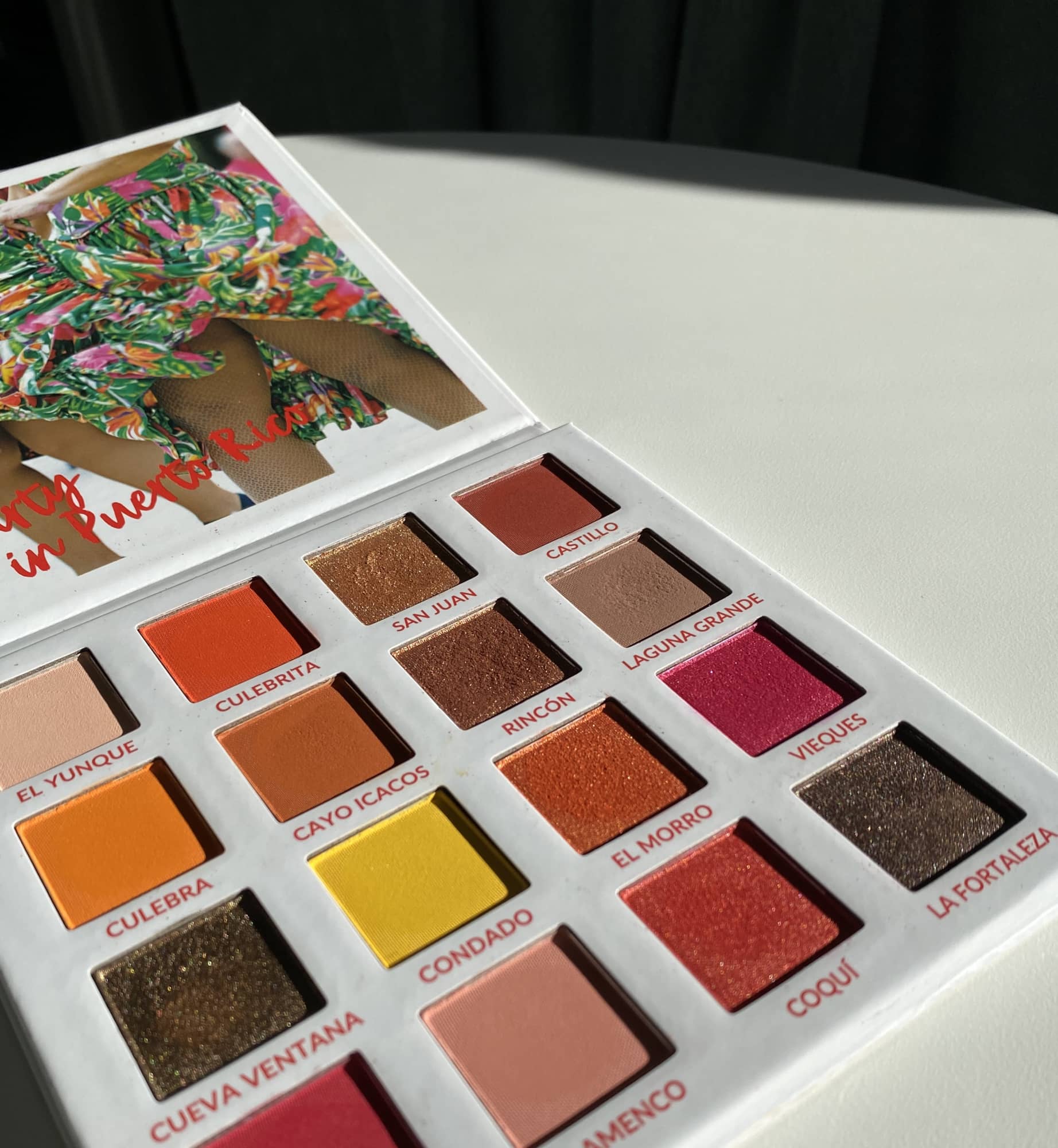 • The eyeshadow palette features 16 shades with names like “San Juan” and “Coquí.”