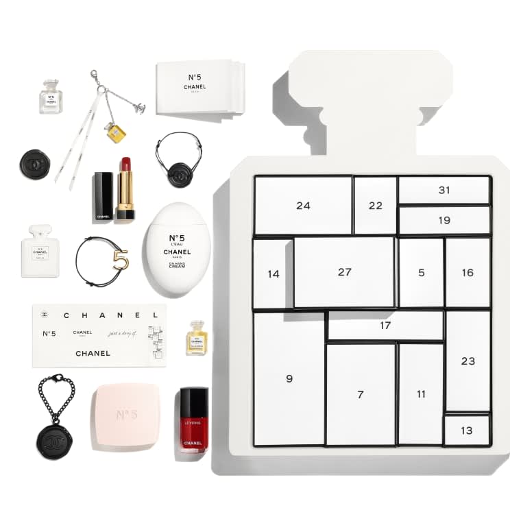 Shaped like a bottle of Chanel No.5, that’s not the only thing that makes the No.5 holiday calendar unique. Instead of the usual 25 boxes like most advent calendars have, this one contains 27; and instead of those boxes being numbered 1 to 25, they’re numbered 5 to 31 in an homage to the brand – 5, because, well . . . Chanel No.5, and 31, which invokes the street number of Coco Chanel’s art-filled apartment and salon at 31 rue Cambon in Paris.