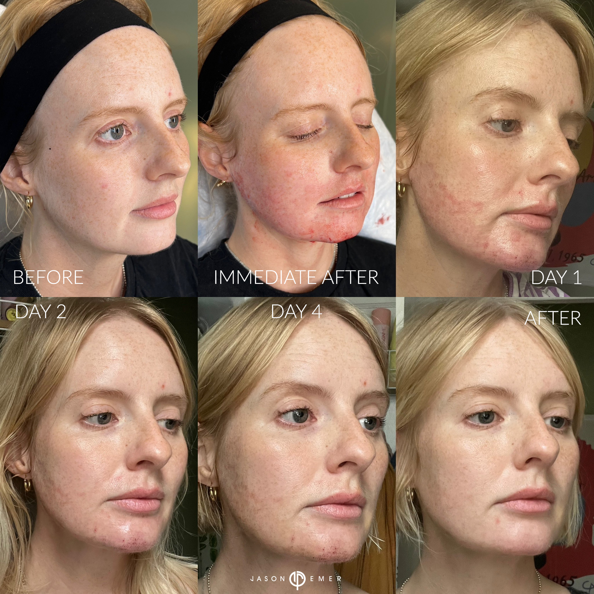 Once in the treatment room, a topical numbing cream was applied to the areas that I was treating and a skin-care consultant joined us to explain the aftercare process to me while the numbing cream took effect. I was given a detailed skin-care guide and we chatted through the products I already had at home (like hyaluronic acid and vitamin C serums and retinol) and what I would need for the office’s recommended Emer Skin regime – a carefully-curated series of medical-grade anti-inflammatories, skin brighteners, hydrators, and antioxidants. Though it may seem like an excessive amount of products at first, they all play an important role in helping your skin fully heal.