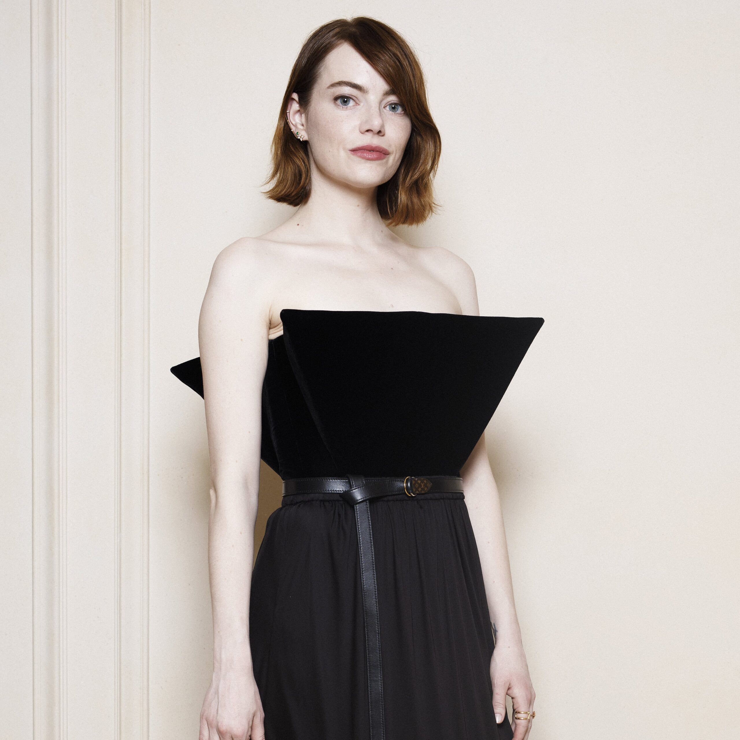 Before she chopped her hair into a bob haircut in early 2023, Stone had long, copper hair with chunky blond highlights.