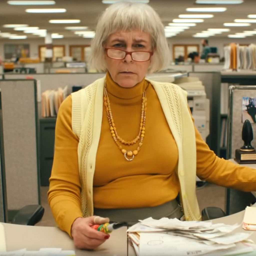 There’s a funny story behind the shaggy microbob hairstyle Curtis wears in the movie – it was all her own doing. “Jamie actually pulled that photo off of one of our mood boards,” Salazar says. “She said, ‘I just want to be her. This is my goal now for the movie.'” The image that was calling to her was a stock photo of an IRS tax agent who she says “looked very angry.”
