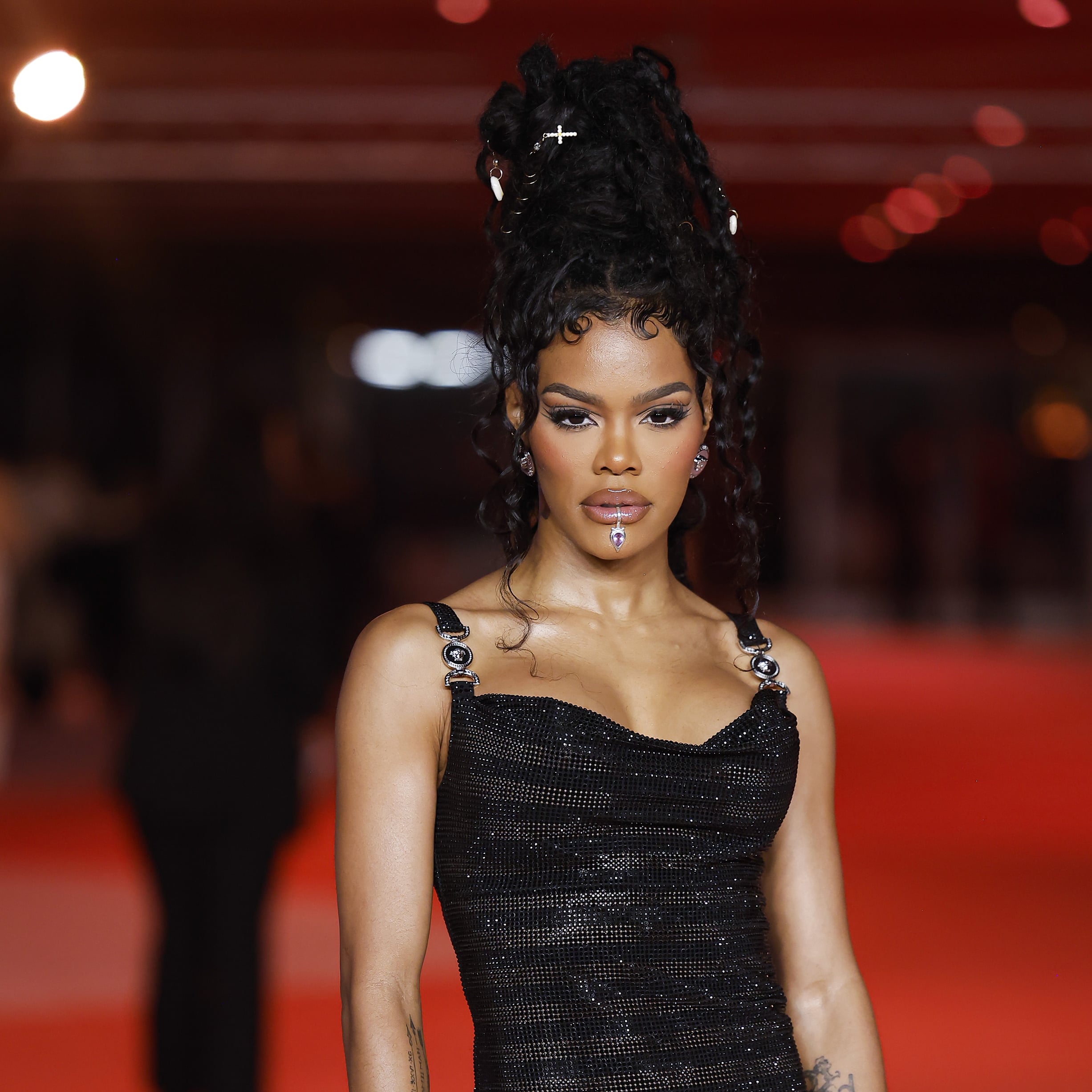 Teyana Taylor styled her goddess locs into an updo for the event, but the look wasn’t complete without a few small cross and shell hair accessories.