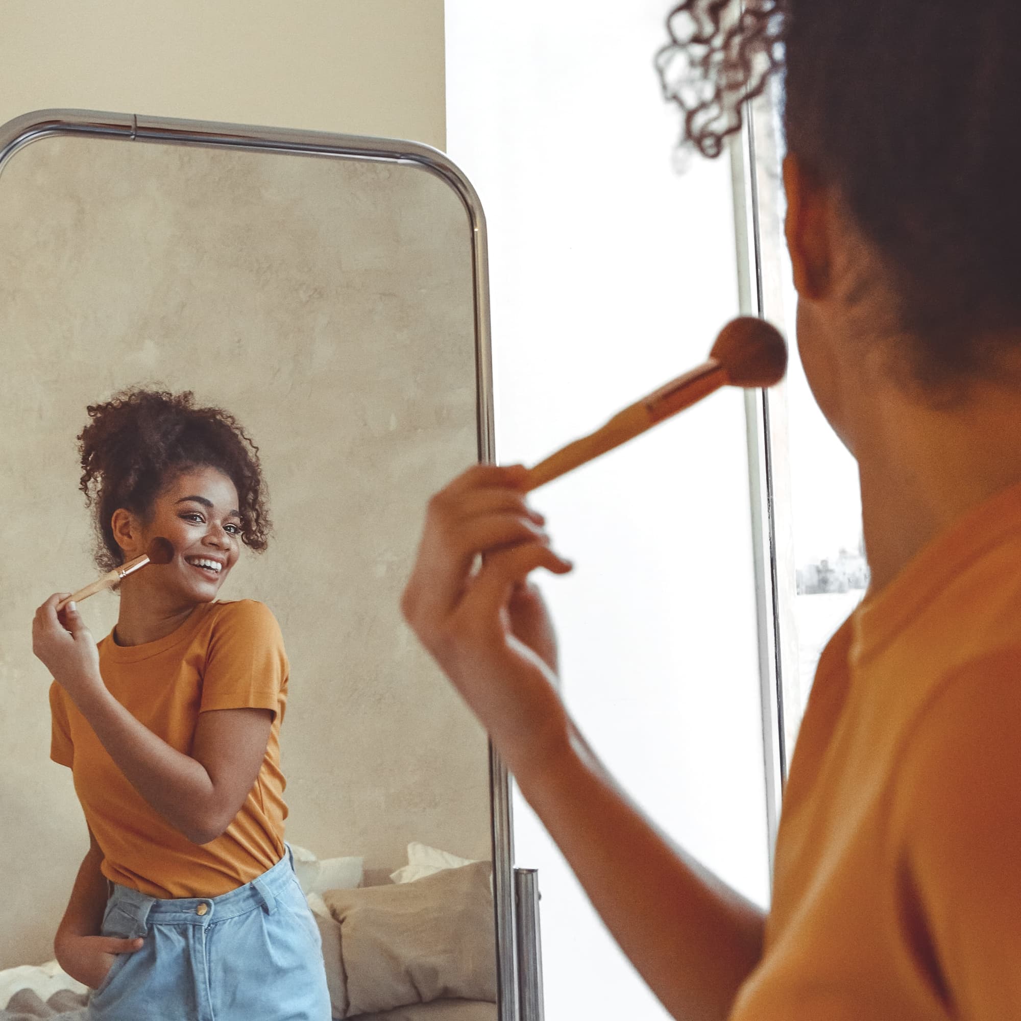 To create a “lifted” look, Rye has a piece of advice: instead of applying in a circular motion to the apple of the cheeks, instead do a sweeping motion, going outward and up toward the temples. This can help accentuate the cheekbones and give a youthful glow.