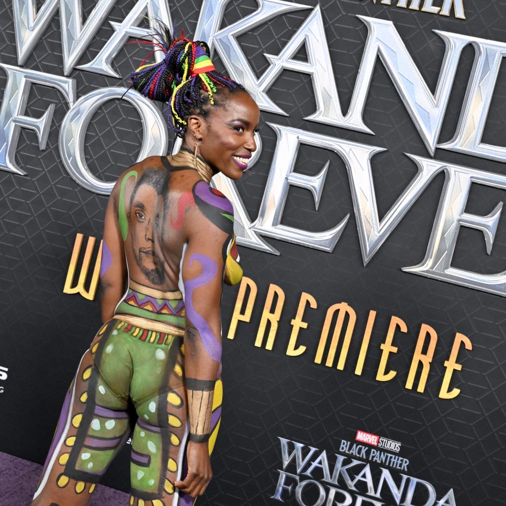 Janeshia Adams-Ginyard didn’t wear clothes to the “Black Panther: Wakanda Forever” premiere on Oct. 26. Instead, the actor and stuntwoman covered her entire body in paint, paying tribute to late costar Chadwick Boseman, who played T’Challa in the first “Black Panther” movie and passed away before filming the sequel.