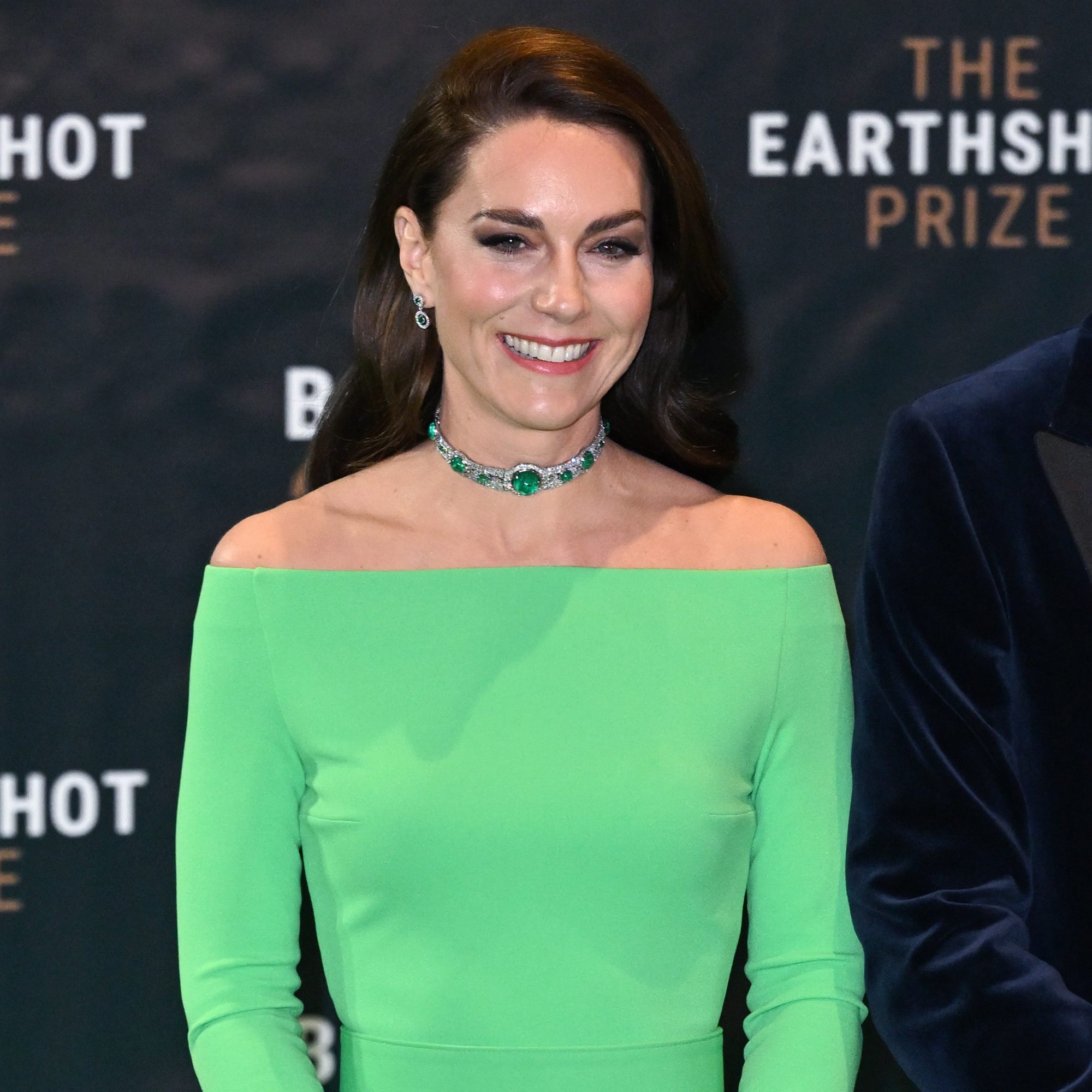 Dressed in a rented bright green Solace London gown and emerald-and-diamond choker (which once belonged to Princess Diana), Middleton stood out on the green carpet at the banquet for environmentalism. Her hair and makeup followed suit. Instead of her trademark blowout with a middle or slightly off-center part, Middleton’s hair was parted deeply to one side with dramatic, voluminous curls, giving her look a touch of Old Hollywood glamour. Her makeup featured a soft-brown smoky eye (something the royal is rarely ever seen in), coral blush, and a complementary pink lip. This is quite the departure from the minimalist makeup she tends to go for.