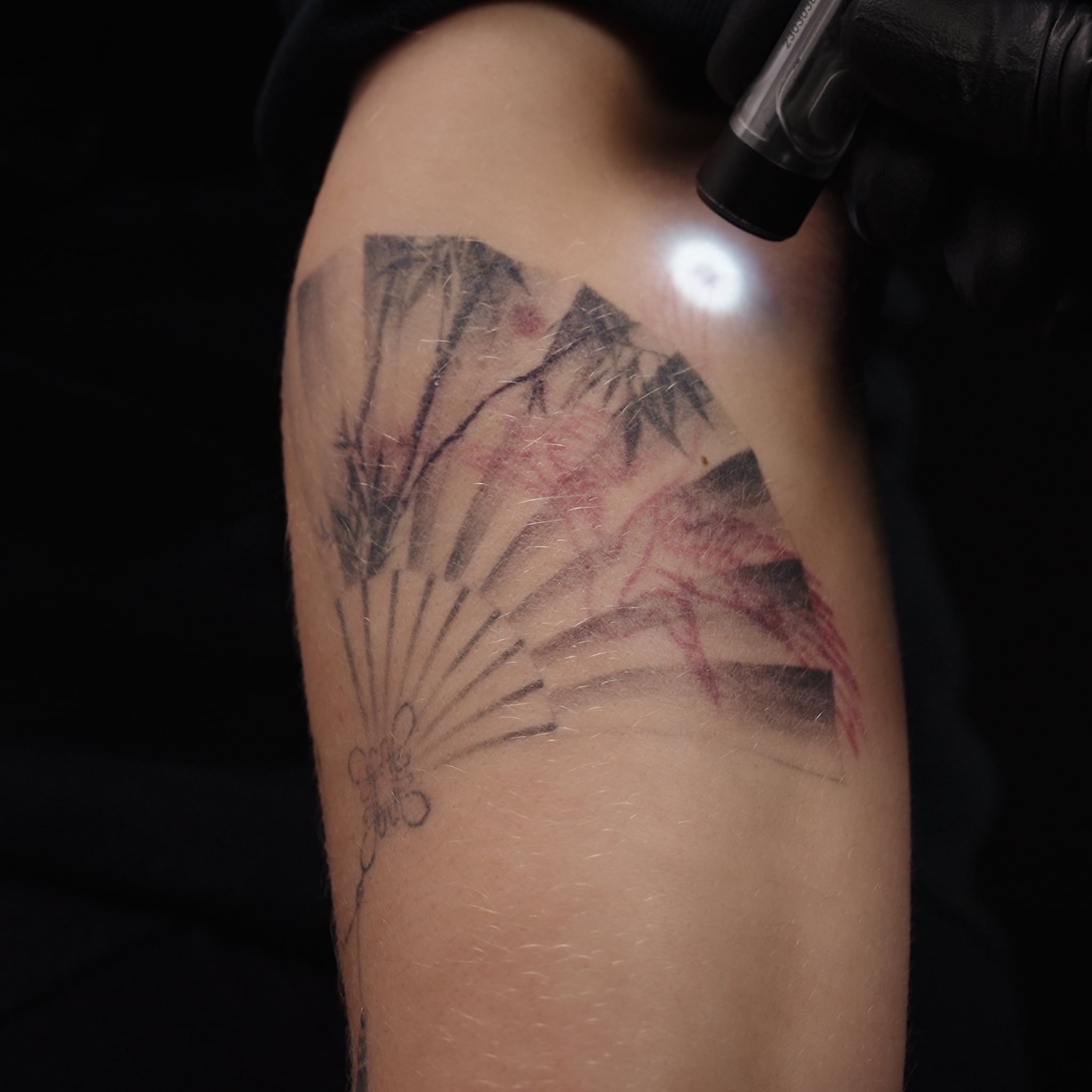 Any form of visible light can activate the tattoo, including the flashlight on your phone, and to reverse the reaction, you use a UV flashlight. These two forms of light can display and hide the ink within seconds. To change the design within your skin, which was another dream of Bang’s, the idea is to tattoo a solid area of Magic Ink and use light to activate specific particles.