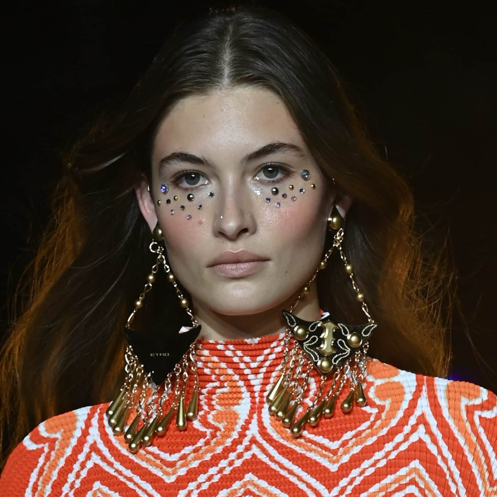 We’ll never tire of a face-crystal moment, especially with prismatic crystals that reflect a variety of colours of the rainbow – like the look seen here at Etro’s spring 2022 show.