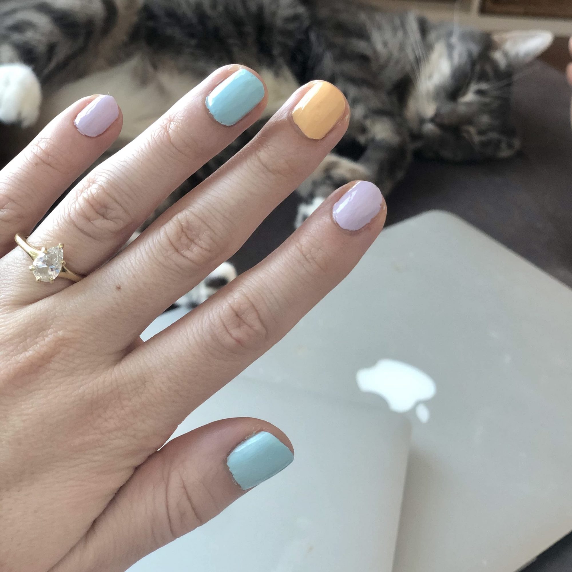 Right now, my agitated mind seems to only relax for a second when I line up my square bottles of Essie polish, plop down on a chair at my kitchen counter, and get to painting. When I first hauled my DIY manicure supplies out on a whim, I chose one shade to use on all my nails. I assumed I’d keep that colour on until it was finally too chipped to be respectable via Zoom. Soon, I found myself reaching back into my polish collection nearly every day to pick out a new shade and repeat the whole process. Now, five weeks into social distancing, I’m wearing three different, equally cheerful shades on each hand: robin’s egg blue, pale lilac, and pastel yellow. It’s not the sort of sophisticated look I’d normally go for, but hey, these are strange and unprecedented times.