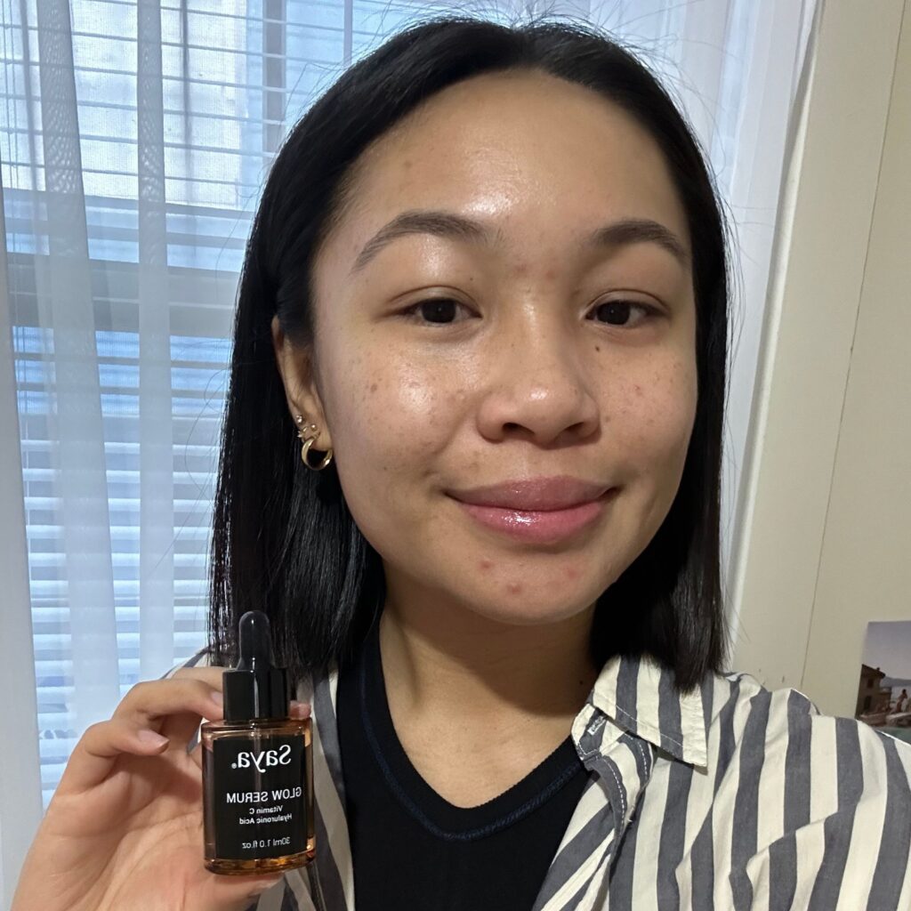 After washing my face the following morning, I tested out the Saya Glow Serum in place of my regular Vitamin C product. Compared to Saya’s Renew, this has a thinner consistency and a lightweight feel. The formula easily absorbed into my skin without leaving an oily residue. And one of my favourite things about it — no scent.