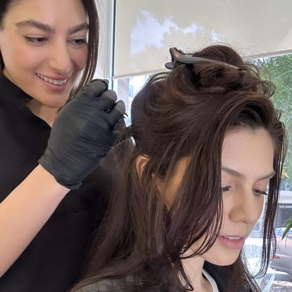 On that note, I headed to Dripology to have my stem cells retrieved. During the appointment, I sat in a chair as aesthetic nurse Rana Jaffari began sifting through my hair in search of 50 follicles to pluck. Each time she plucked a hair, she had to check the end – when she could see the white bulb at the base, that’s when she knew the follicle was intact. Then she snipped it off using a pair of scissors, into a vial containing a preservative gel, before proceeding to the next strand.