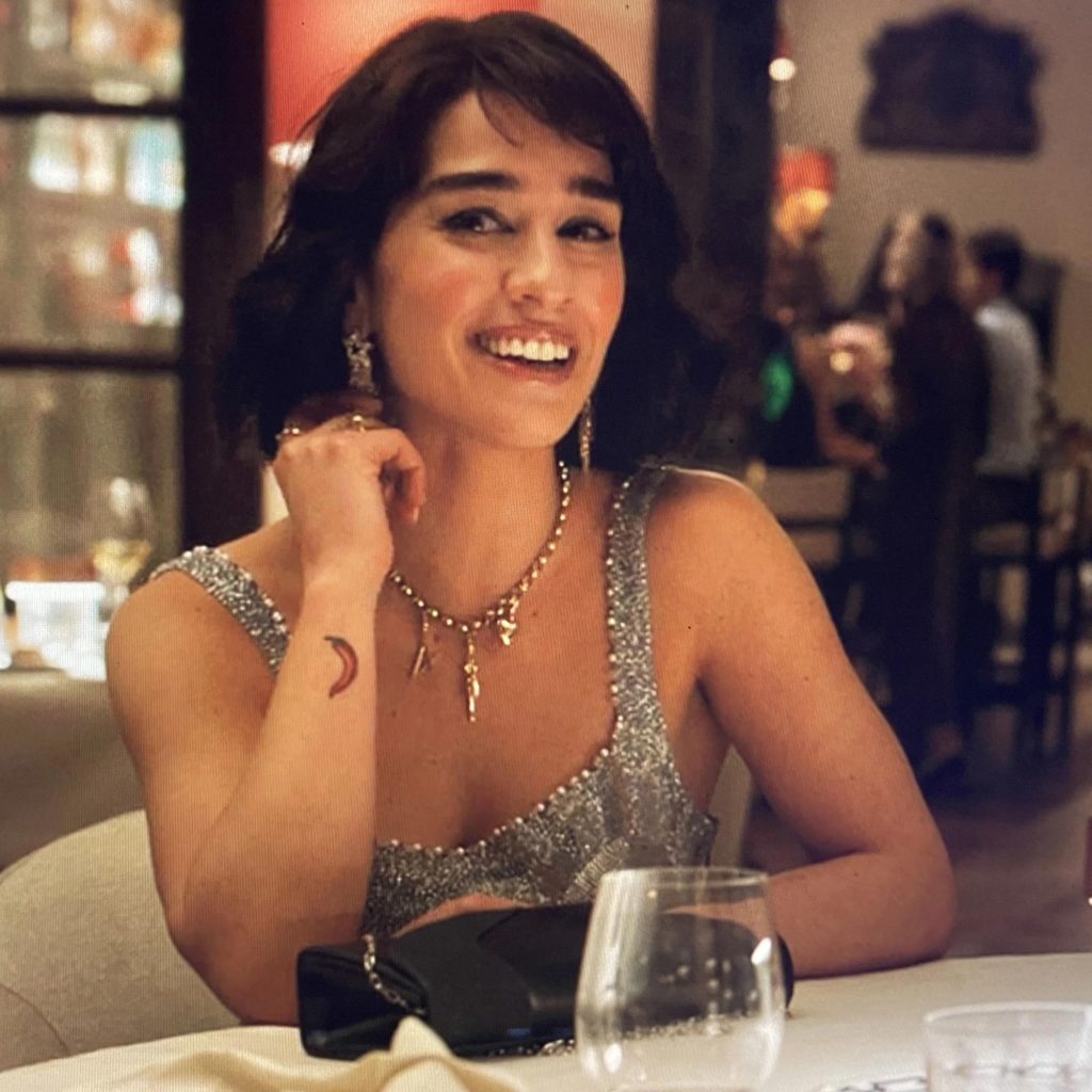 Lucia (Simona Tabasco) has a red-pepper symbol tattooed on the side of her forearm, near her right wrist. As one Reddit user theorized, the design resembles a cornicello (an Italian horn), widely considered a harbinger of good luck. Considering how her character’s fate turned out, one might presume the ink was subtly nodding to how she would eventually use her wits on Albie (Adam DiMarco) and get him to send her 50K euros by making him believe that she’s in fatal danger. This also echoes the statement she makes to Mia in episode six – “This is a lucky week for us. I feel it.”