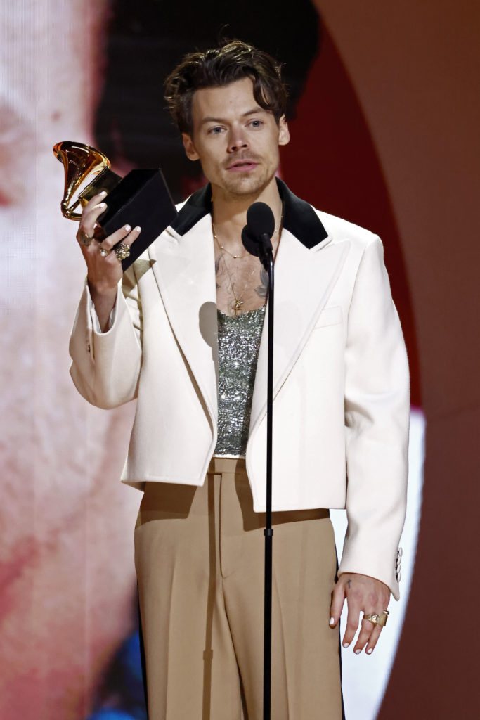 After dazzling the red carpet in his eye-catching bejewelled patchwork overalls, the “As It Was” singer took out the award for Best Pop Vocal Album for “Harry’s House”.