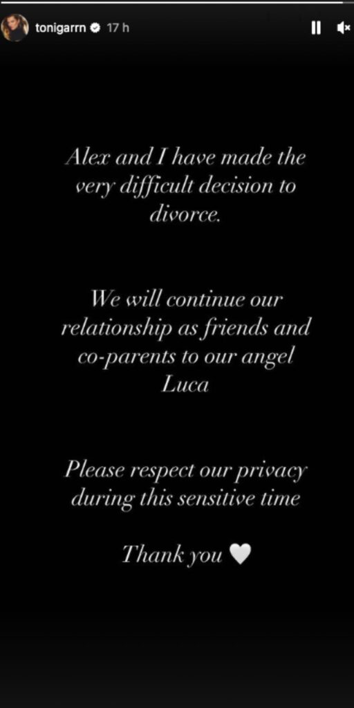 “Alex and I have made the very difficult decision to divorce,” she wrote. “We will continue our relationship as friends and co-parents to our angel Luca. Please respect our privacy during this sensitive time. Thank you.”