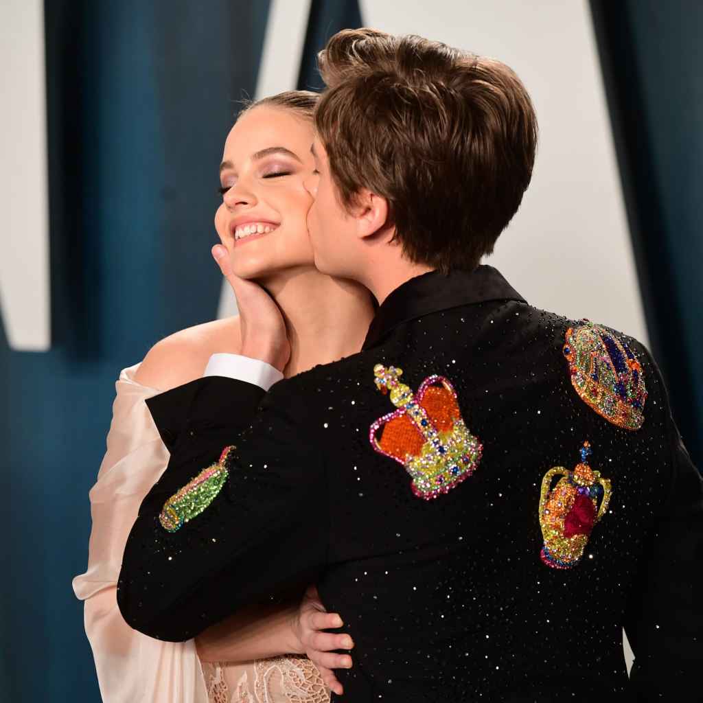Barbara wore a romantic nude dress with a high leg slit, while Dylan essentially looked like her Prince Charming in a blazer featuring several embroidered crowns. Though they served many modelesque poses with smoldering expressions, the couple also cracked up quite a bit as Barbara offered a purposefully corny thumbs-up and Dylan, who was also captured adjusting Barbara’s dress at one point, gave her a sweet kiss on the cheek. See all the photos ahead.