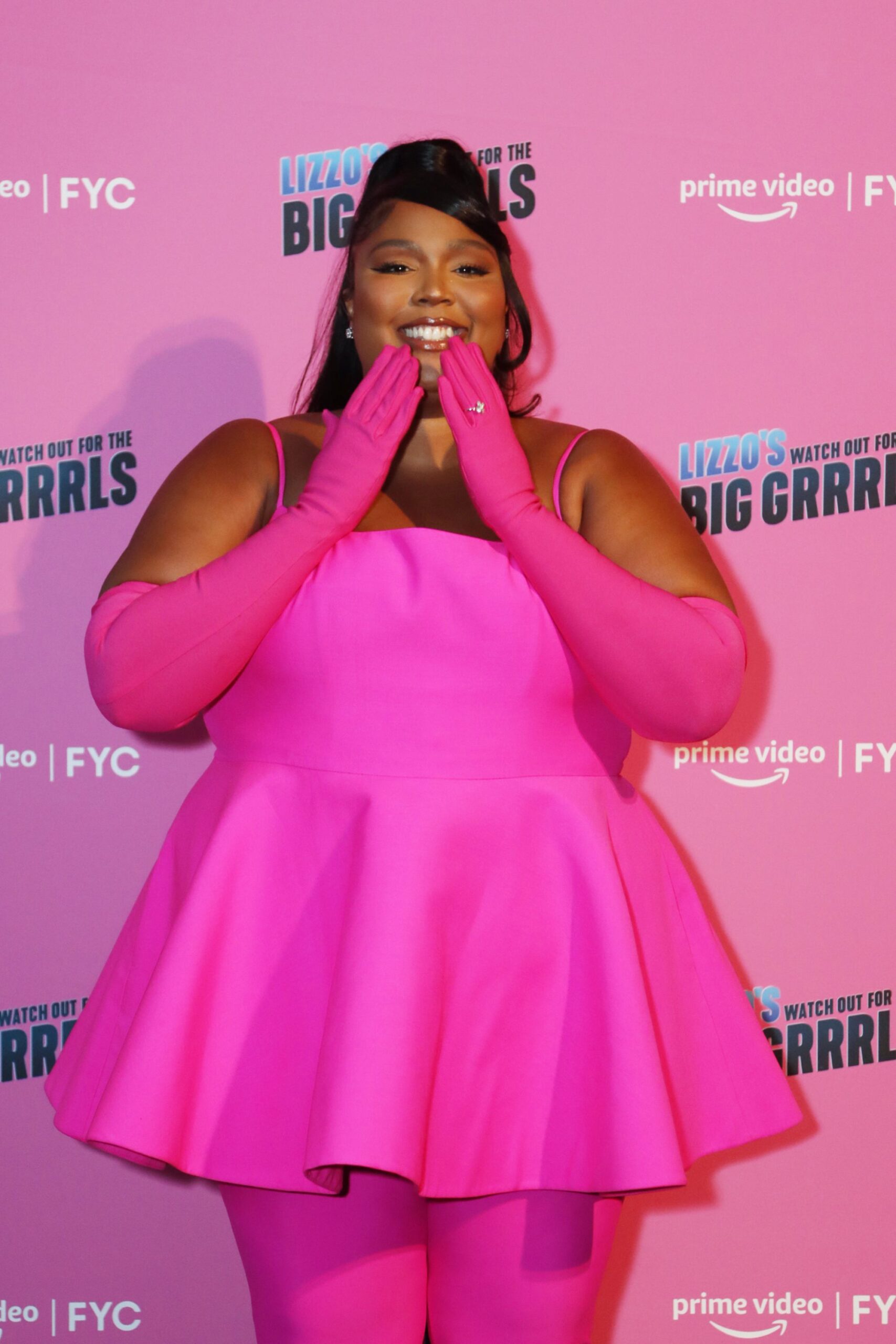 Lizzo looked vibrant at her “Lizzo’s Watch Out For the Big Grrrls” premiere in a hot-pink ensemble from Valentino’s fall/winter 2022 pink collection. She wore a pleated skater minidress with matching bright-pink opera gloves, pink tights, and platform pumps, giving huge Barbie fashion vibes.