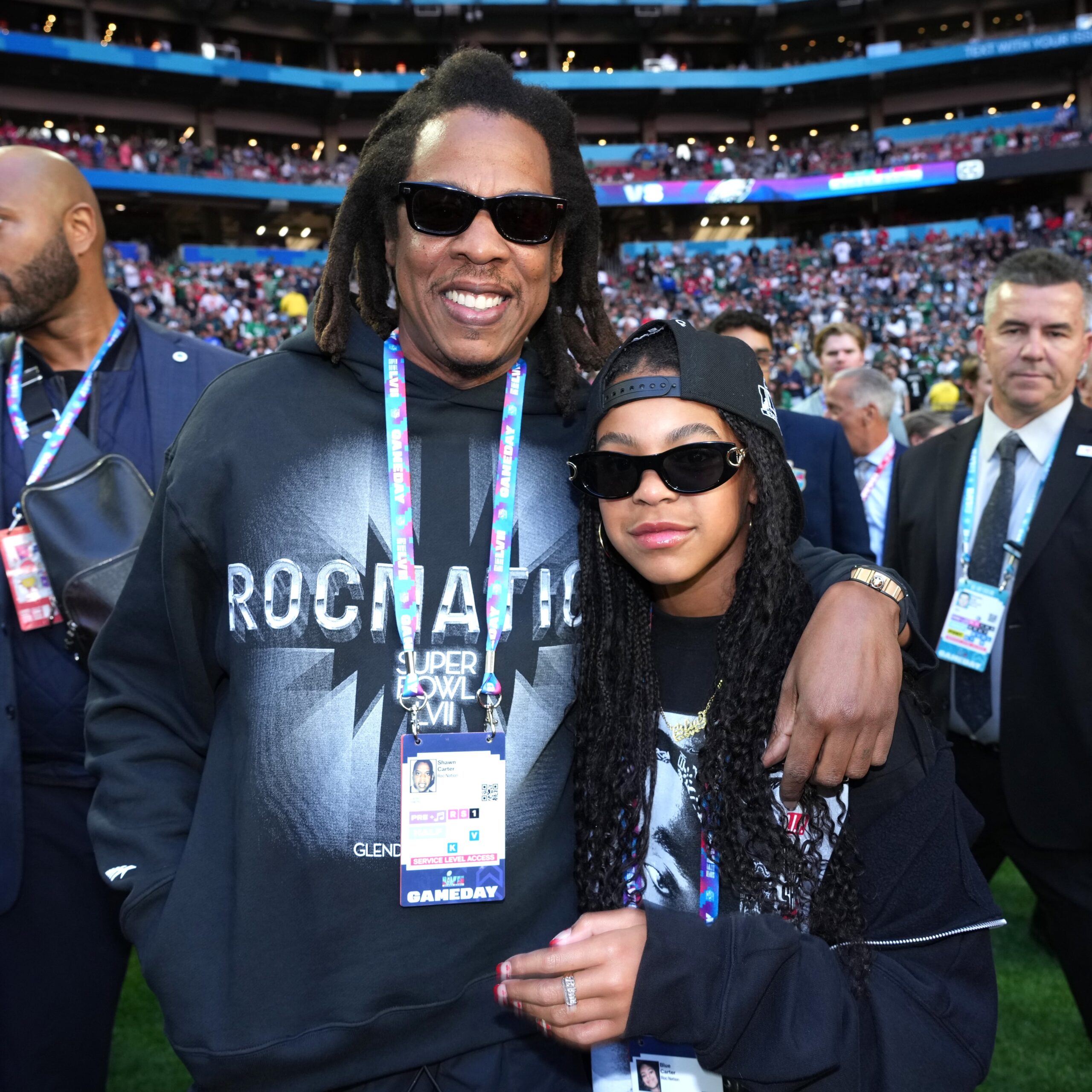 Take, for example, when the father-daughter duo attended the 2022 NBA Finals in San Francisco last year. For the outing, Blue Ivy wore low-top Nike Dunk sneakers, sweatpants, a black leather jacket, and a “Brown Skin Girl” T-shirt from mom Beyoncé’s merch line. JAY-Z complemented his daughter’s look in an all-black outfit and white sneakers. The preteen also spent some quality time with her dad at the 2023 Super Bowl in February, during which the pair wore all-black ensembles and matching sunglasses.
