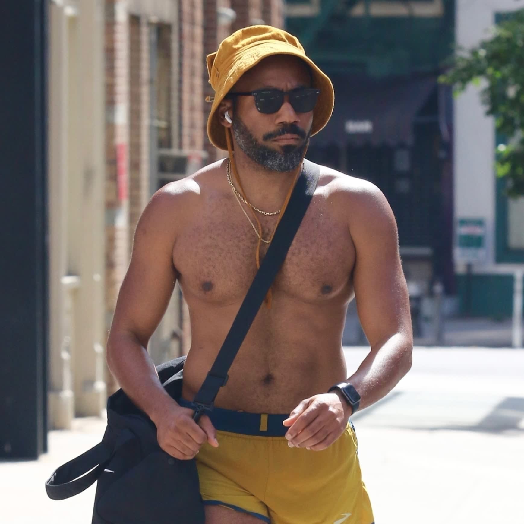A shirtless Glover showed off his physique on the streets of SoHo wearing nothing but a bucket hat, athletic shorts, and sneakers, all of the same mustard-yellow hue. His shorts weren’t just any ol’ athletic shorts, though – the hemline reached noticeably high and offered perhaps one of the most generous views of his muscular legs we’ve seen yet. With a Nike duffle bag slung over one shoulder and wireless earbuds in his ears, he appeared to be leaving or en route to a gym, which would certainly explain his sporty getup. Oh, how we wish he’d treat the world to a shirtless workout video.