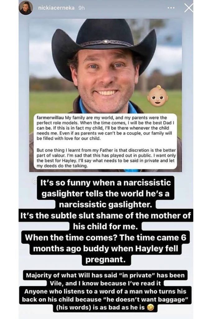 Nickia, who is a close friend of Hayley’s, criticised Will for his Instagram post, saying he should have taken responsibility when Hayley told him she was pregnant.