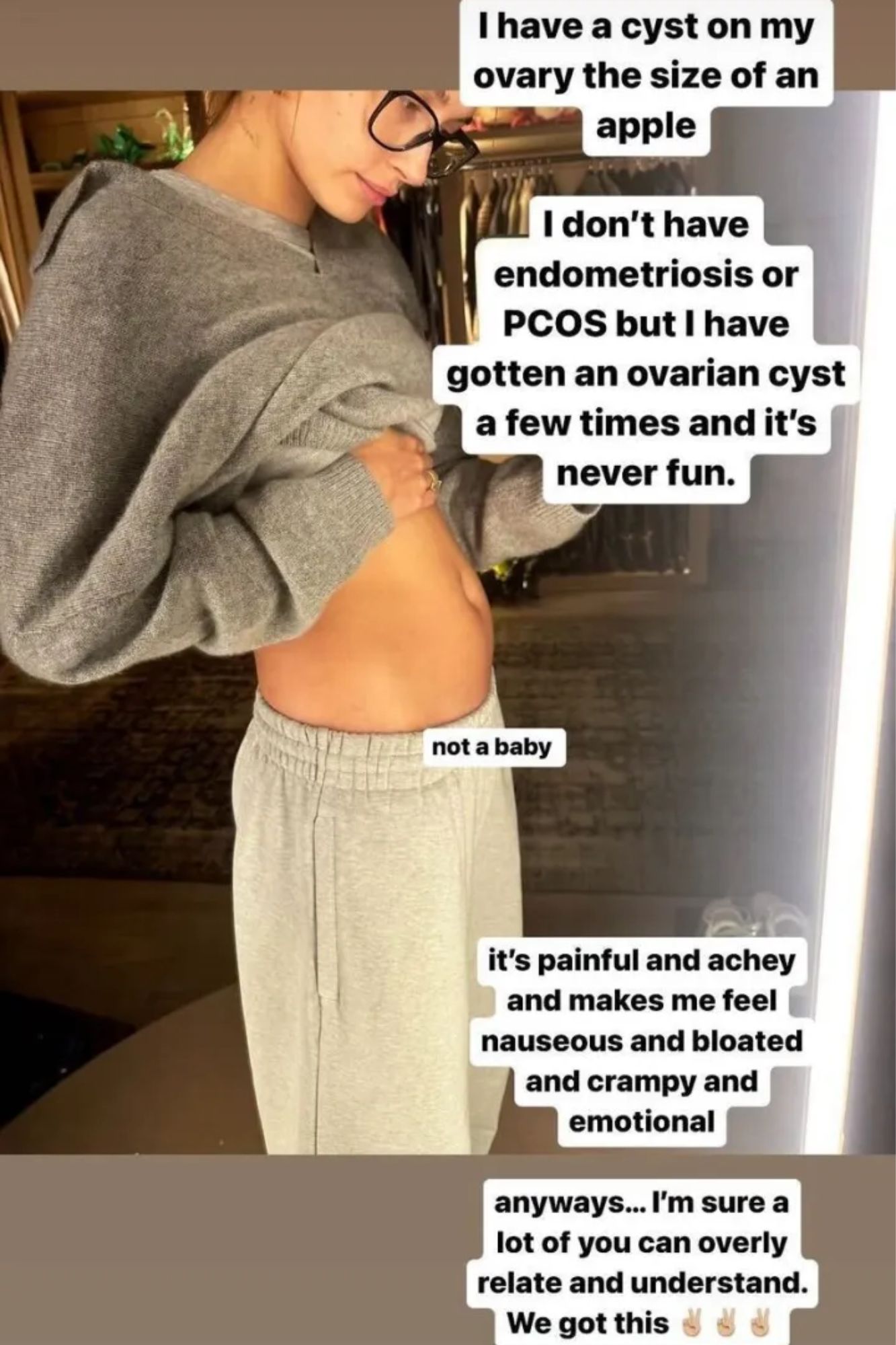 Hailey Bieber put those pregnancy rumours to rest on Instagram, explaining that she has an ovarian cyst “the size of an apple” which has been causing her to bloat.