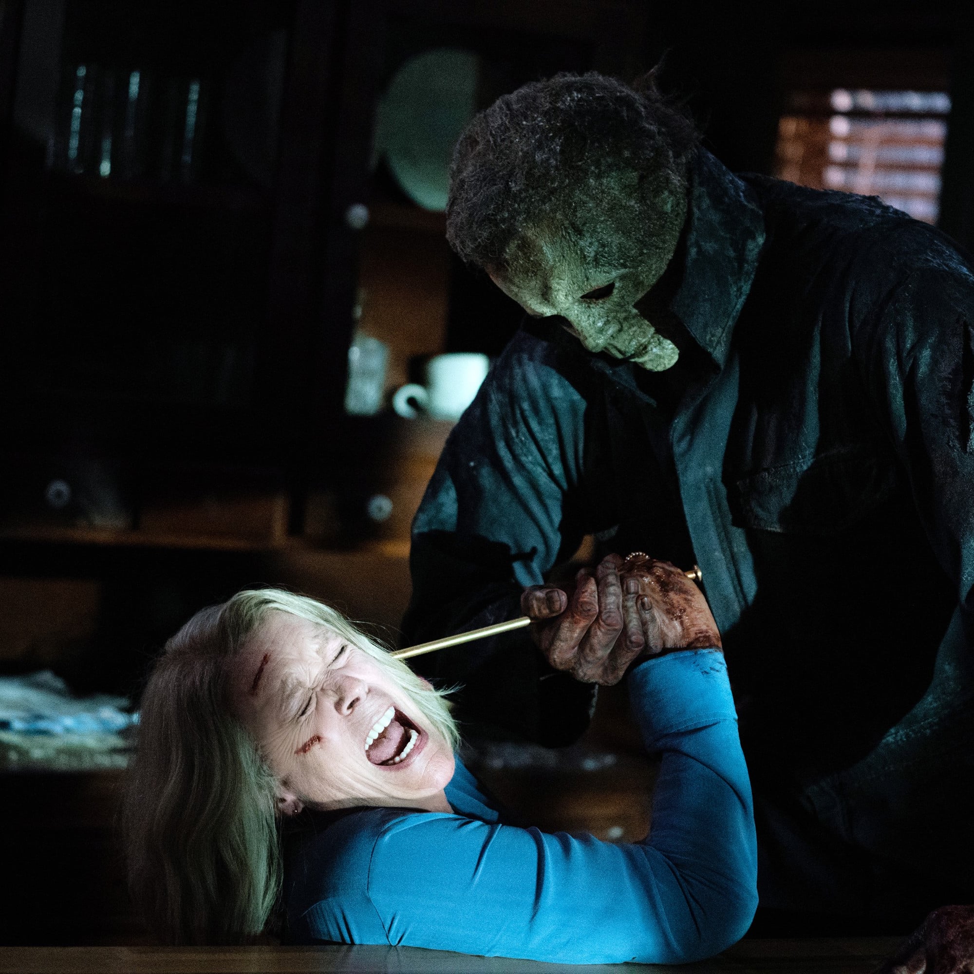 Eventually, though, Laurie gets the upper hand, and she uses a knife to pin him to her kitchen table. She knocks over her refrigerator so it lies on top of him, too. She slashes his throat, but somehow he’s still alive, and he grabs her by the neck, crushing her. But thankfully Allyson has returned, and she saves her grandmother. Together, they slash Michael Myers’s arms, covering themselves and the kitchen in blood.