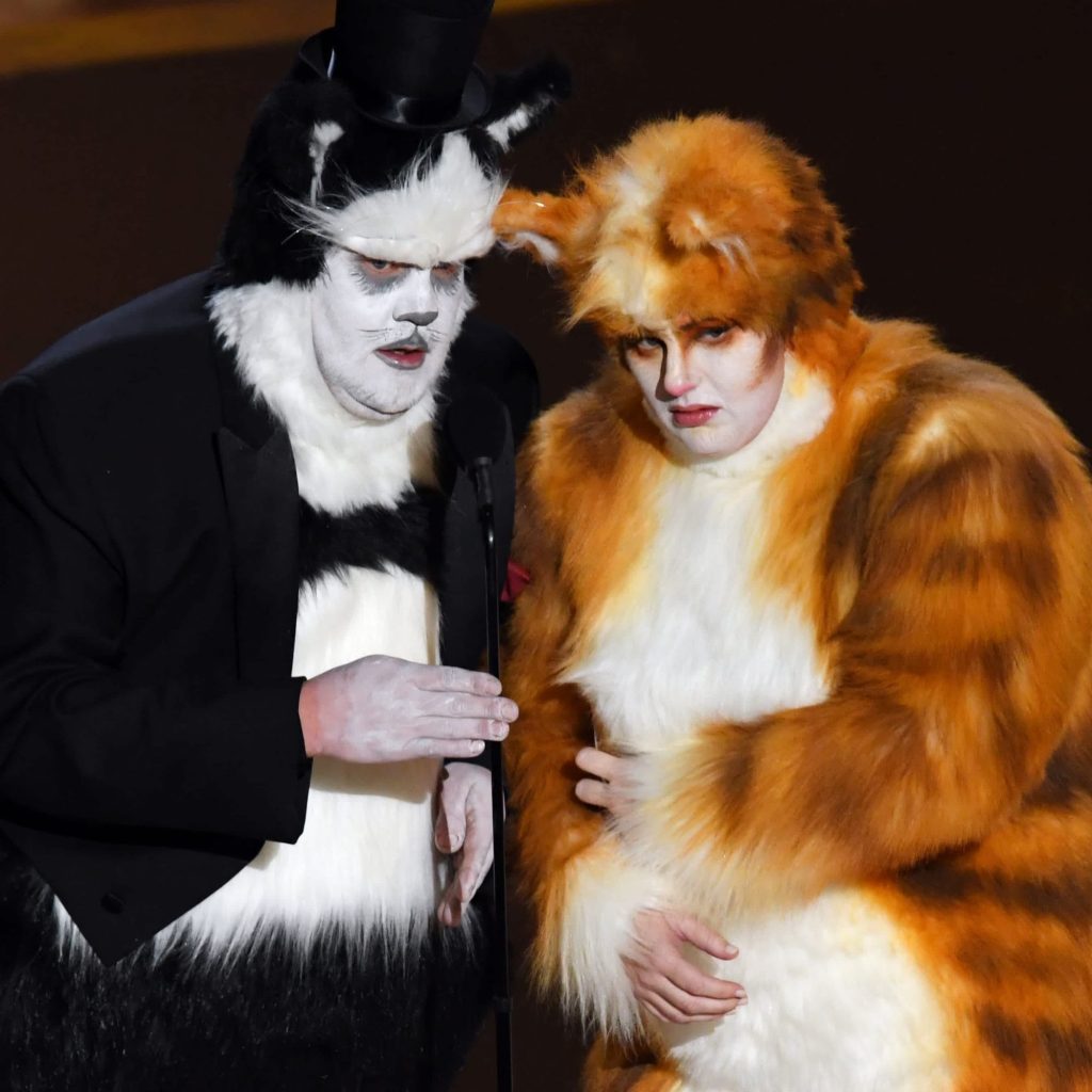 Bustopher Jones and Jennyanydots – er, we mean James Corden and Rebel Wilson – put their best paws forward as they attended the Oscars on Sunday night. Though their film Cats received negative reviews from critics and failed at the box office, the costars proved they can laugh at themselves as they presented the award for best visual effects in furry costumes. “As cast members of the motion picture Cats, nobody more than us understands the importance of good visual effects,” they said. The sketch was clearly poking fun at their own film, which made headlines for its unfinished CGI and crazy visual effects. At one point, they even channeled their feline characters by hissing and clawing at the microphone. Whether you loved or hated Cats, you can’t deny this skit was pretty purfect. See more pictures of their appearance ahead.