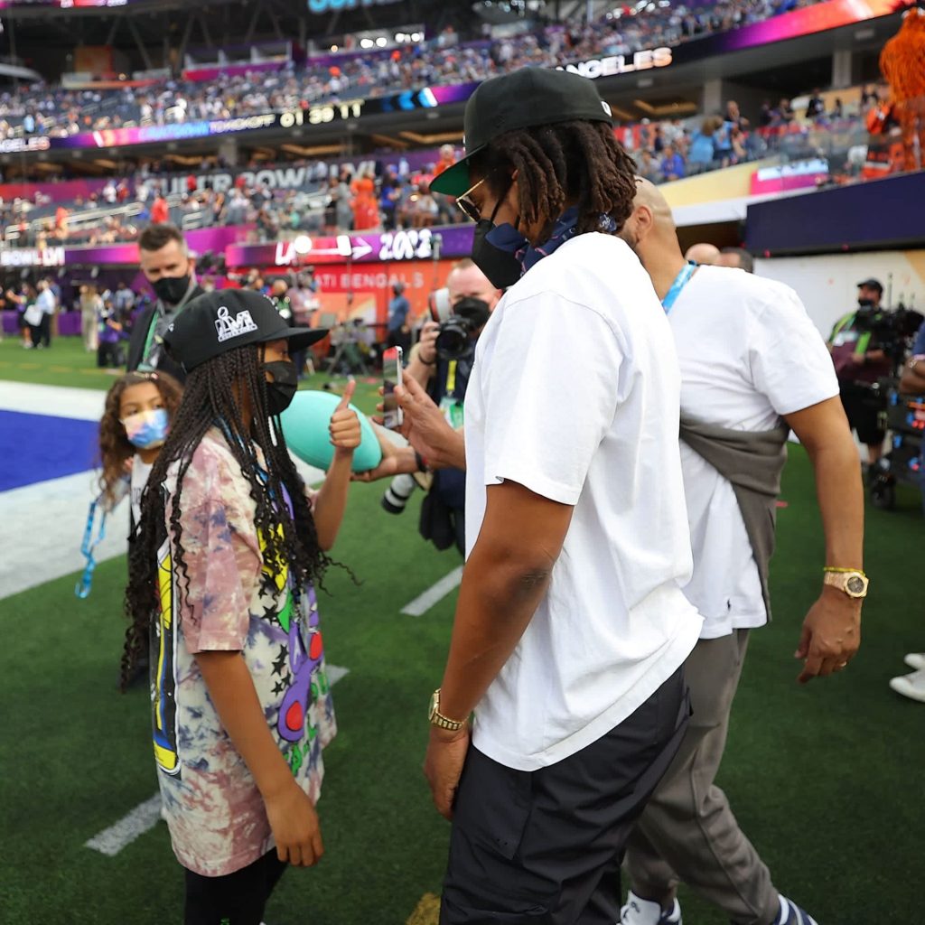 JAY-Z brought a very special guest with him to Super Bowl LVI on Sunday evening. Moments before the Los Angeles Rams and Cincinnati Bengals took the field, Rock & Roll Hall of Fame inductee JAY-Z and his 10-year-old daughter, Blue Ivy Carter, were seen walking the field, snapping photos, and tossing around a football at the SoFi Stadium in Inglewood, CA. On Feb. 13, the NFL’s official Twitter account shared a video of the father-daughter duo hanging out before the game. Keep reading to see JAY-Z and Blue’s cutest moments at the Super Bowl.
