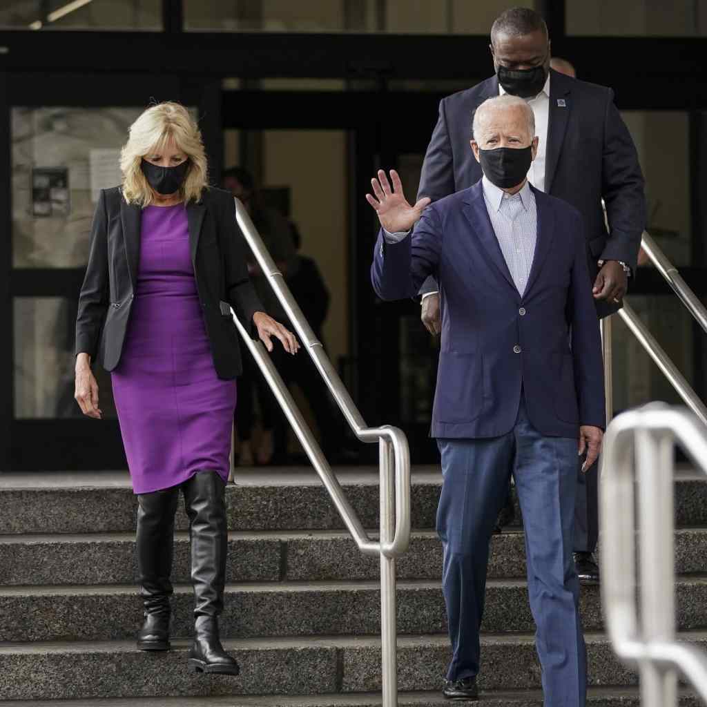 Jill’s over-the-knee black Stuart Weitzman boots looked inconspicuous from the front, but at a side angle, you could see they were detailed with the word “vote” written in silver lettering. She paired the shoes with a jewel tone purple dress and a black blazer, as well as a matching face mask. These shoes are certainly an expensive purchase at $695, but take comfort in knowing that all proceeds go to the I Am a Voter movement which encourages all Americans to participate in the election process.