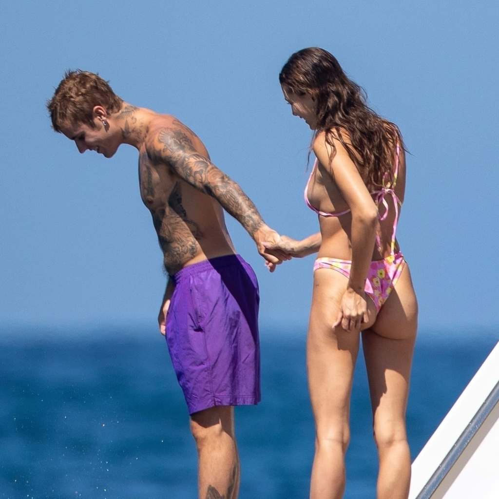 Justin Bieber is taking a break from his world tour to enjoy some well-deserved R&R. On Thursday, the 28-year-old singer was spotted on a yacht in Cabo San Lucas, Mexico, with wife Hailey Bieber and their dog, Oscar. Hailey sported a pink floral bikini with a matching cap, while her husband went shirtless and opted for some purple swimming trunks. The pair made the most of their time out in the ocean as they splashed around in the water and took turns jumping off of the boat.