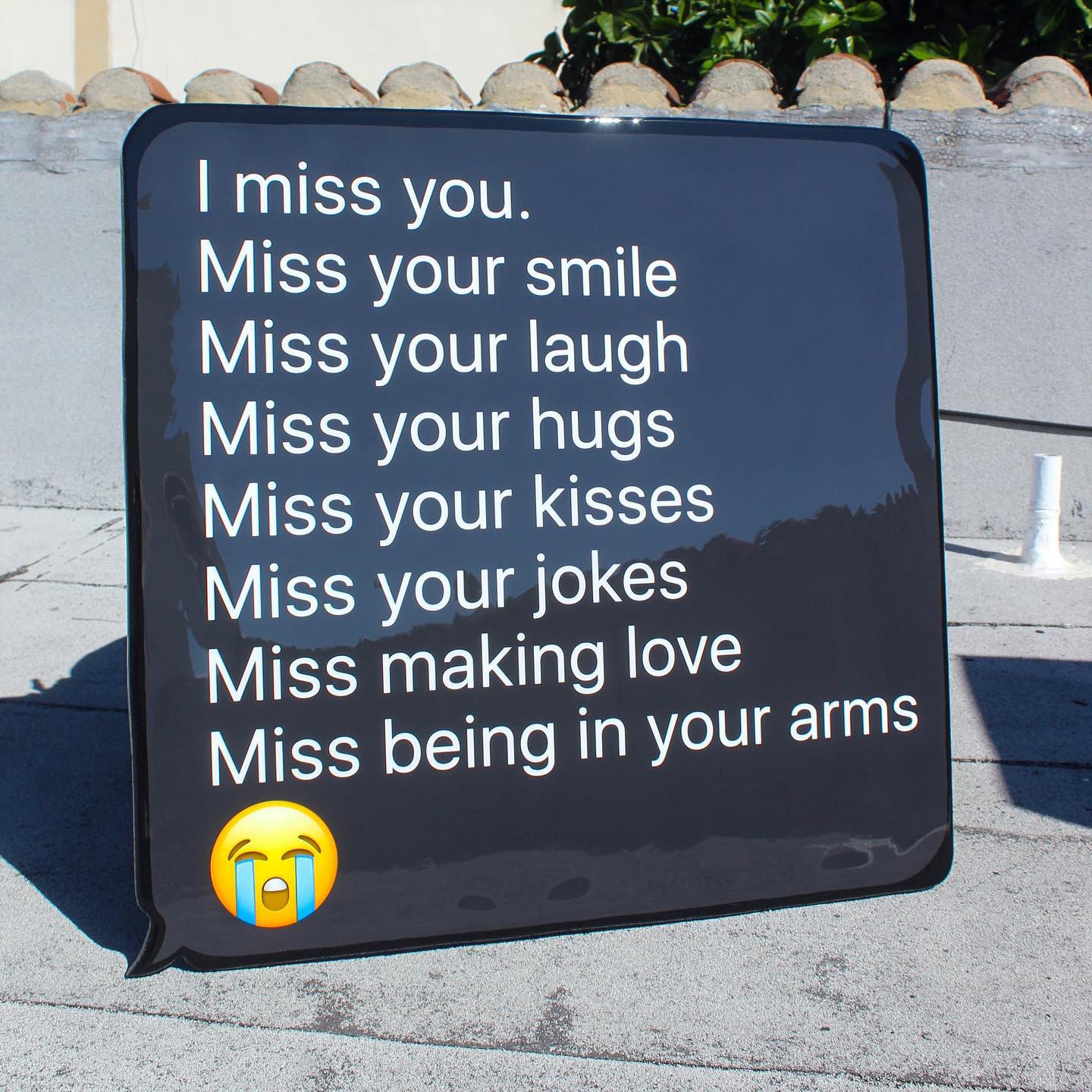 “Justin reached out to us and had us commission the piece as a surprise for [Hailey] while she was away,” artist duo Idiot Box Art tells POPSUGAR. “The art piece is 3ft x 3ft acrylic and resin on a custom wood cutout.” They also shared a few behind-the-scenes clips from the making of the art in an Oct. 11 Instagram post, sawing down the wood base and dedicating the one-of-a-kind piece – aptly called “I Miss You” – to Hailey from Justin, in white marker. “We’ve made a few text bubbles in the past, but this idea was so unique and thoughtful, a text message thread between him and his wife,” the artists wrote in the caption. “Thank you for trusting us with such a special piece.”