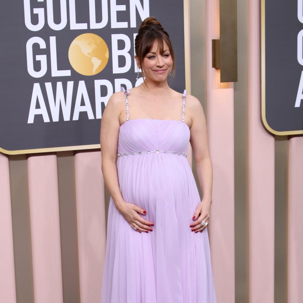 Kaley Cuoco is debuting her baby bump on the red carpet. Just a few days after celebrating her baby shower, on Jan. 10, the “The Flight Attendant” actor attended the Golden Globes with boyfriend Tom Pelphrey. She cradled her baby bump and shared kisses with her beau while wearing a flowing, lavender dress by Vera Wang with beaded straps and a bodice embellished with jewels.