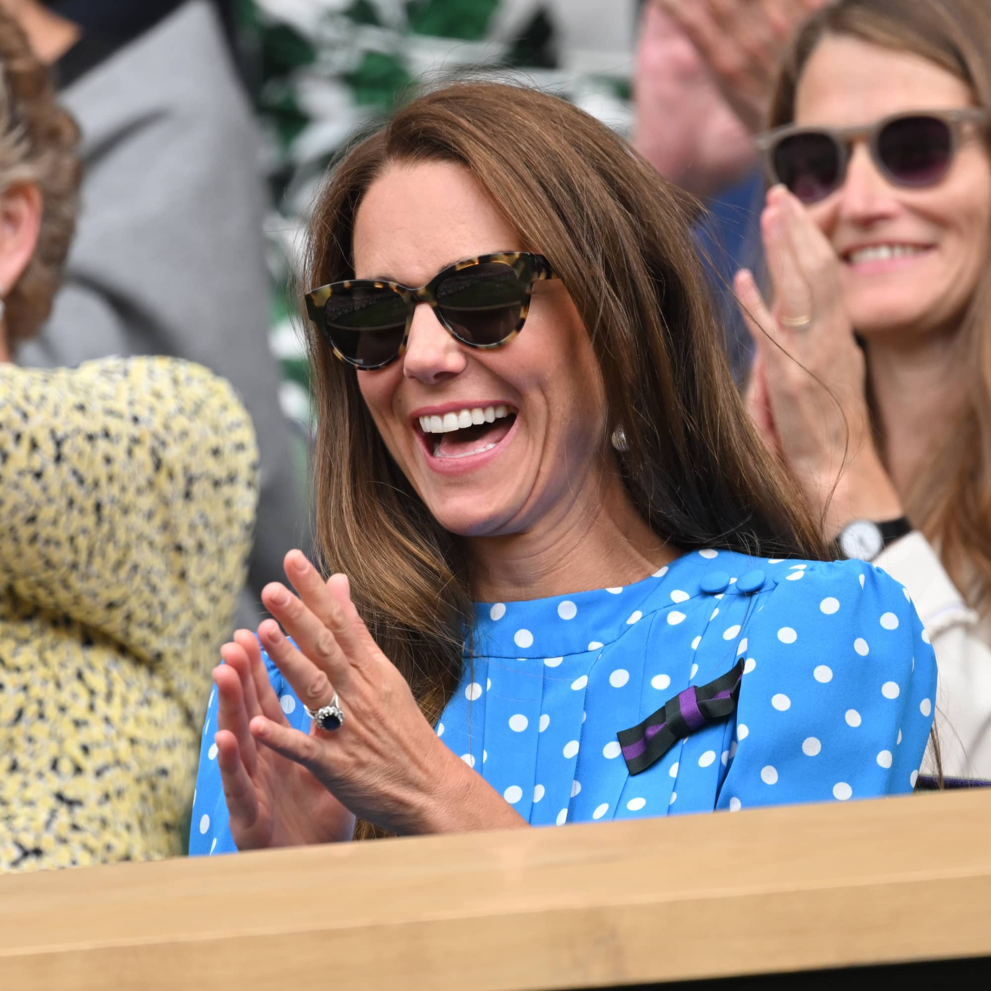 Kate Middleton made her first appearance at Wimbledon on July 5 wearing a gorgeous blue polka-dot dress. Sitting alongside Prince William in the Royal Box to watch defending champion Novak Djokovic, she was spotted laughing, gasping, and cheering at the annual tennis tournament.