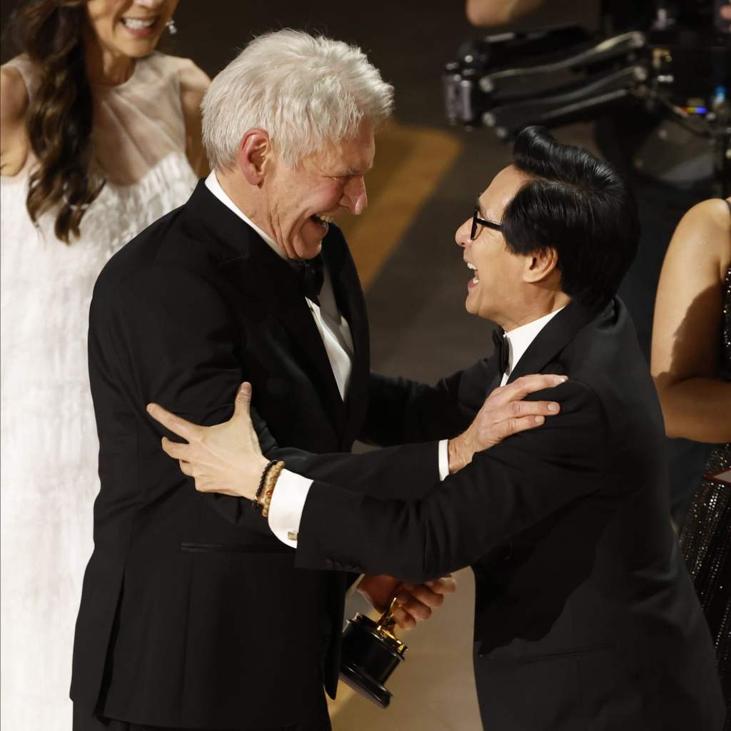 Ke Huy Quan had a major night at the 2023 Oscars on March 12. The “Everything Everywhere All at Once” star won best supporting actor for his role and got to celebrate the movie’s other six wins, including best picture. But perhaps the icing on the cake was Quan’s old Indiana Jones costar Harrison Ford being the one to give the “Everything Everywhere All at Once” cast and crew the biggest award of the night. The acting pair even shared an emotional and loving embrace on stage.