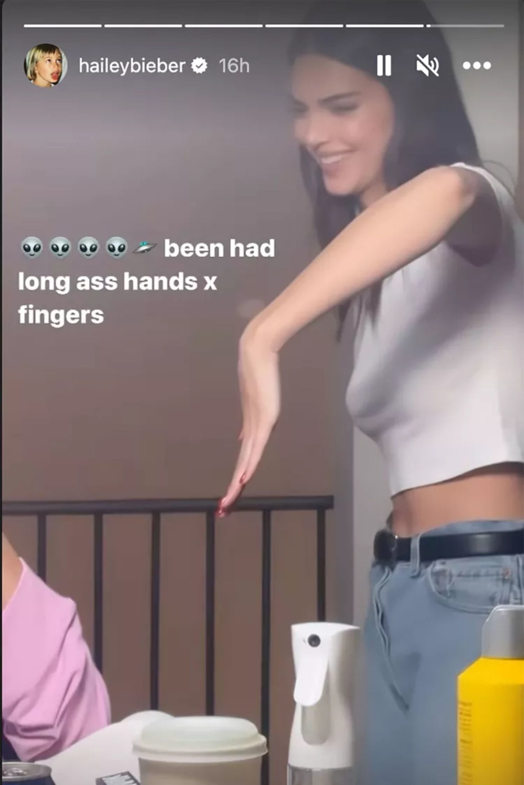 Zooming in on the hand, Bieber captioned the story with “been had long a** hands x fingers” with a bunch of alien emojis.