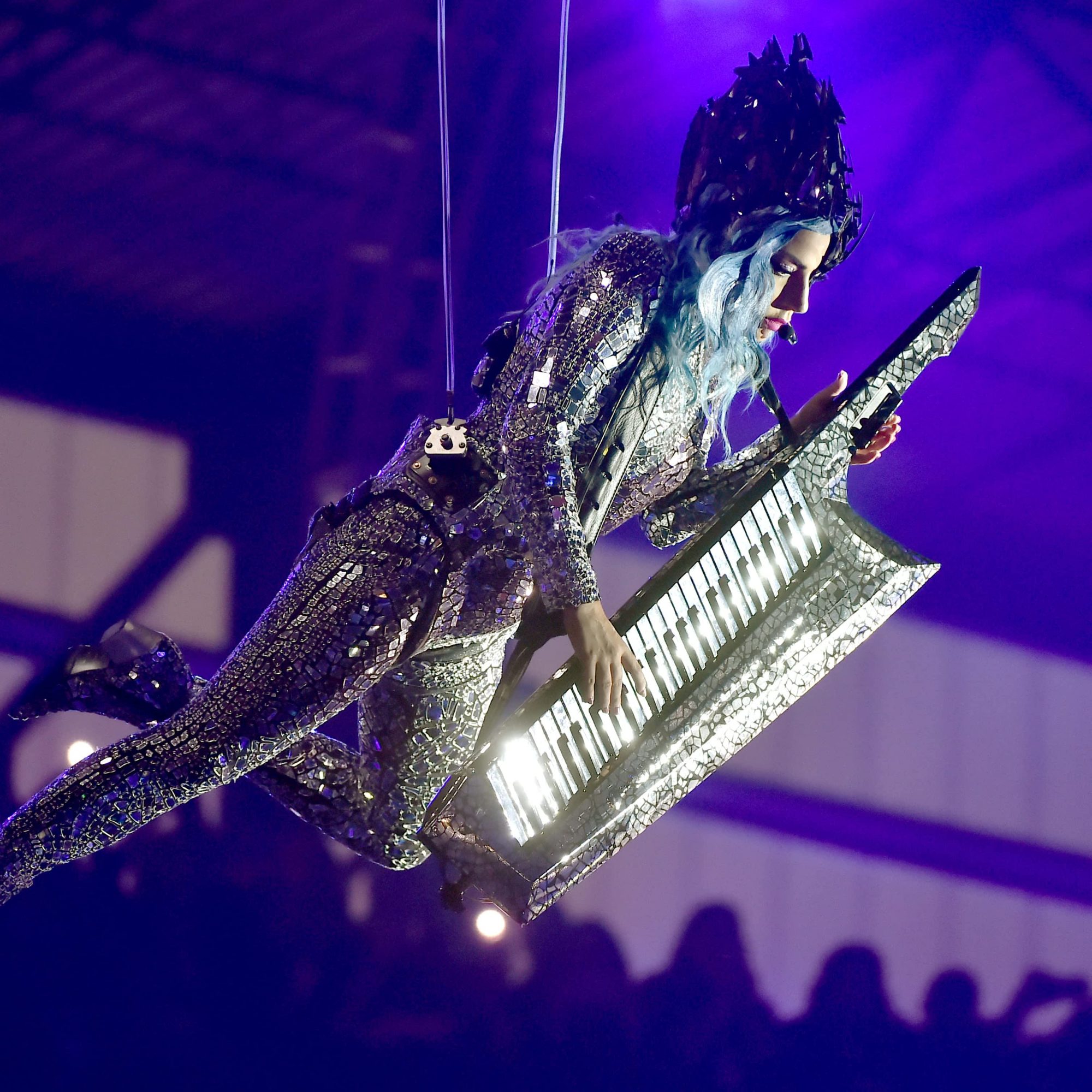 In true Gaga form, the blue-haired songstress donned a few dazzling costumes, including an iridescent jumpsuit and a bodysuit with a green tulle adornment. She also wowed the crowd by suspending herself from the ceiling of the venue, Meridian at Island Gardens, à la her Super Bowl halftime performance in 2017. Check out photos and videos from her high-flying set ahead!