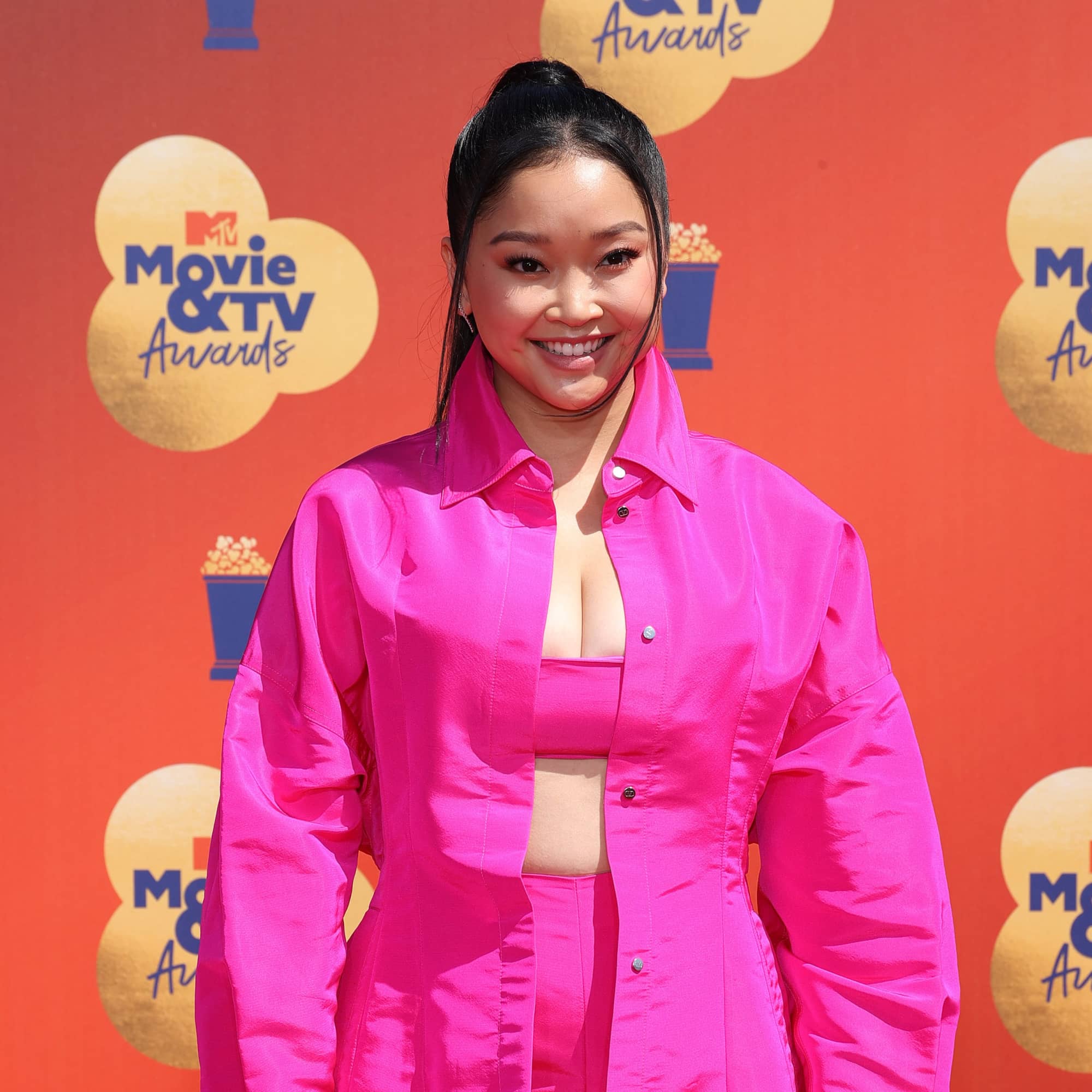 On Sundays, Lana Condor wears pink. The “Boo, B*tch” actor attended the MTV Movie & TV Awards on June 5 wearing an entirely fuchsia outfit from Valentino’s fall 2022 collection. She paired a bandeau bra top and high-waisted shorts with tights, a structured jacket, a top-handle bag, dangly diamond earrings, and her enormous engagement ring from fiancé Anthony De La Torre. But the highlight was certainly her six-inch ankle-strap platform heels, which she walked down the red carpet in with impressive ease. Although Condor isn’t nominated for any awards at this year’s ceremony, she took the stage to present a golden popcorn trophy to the “Loki” cast during the show.