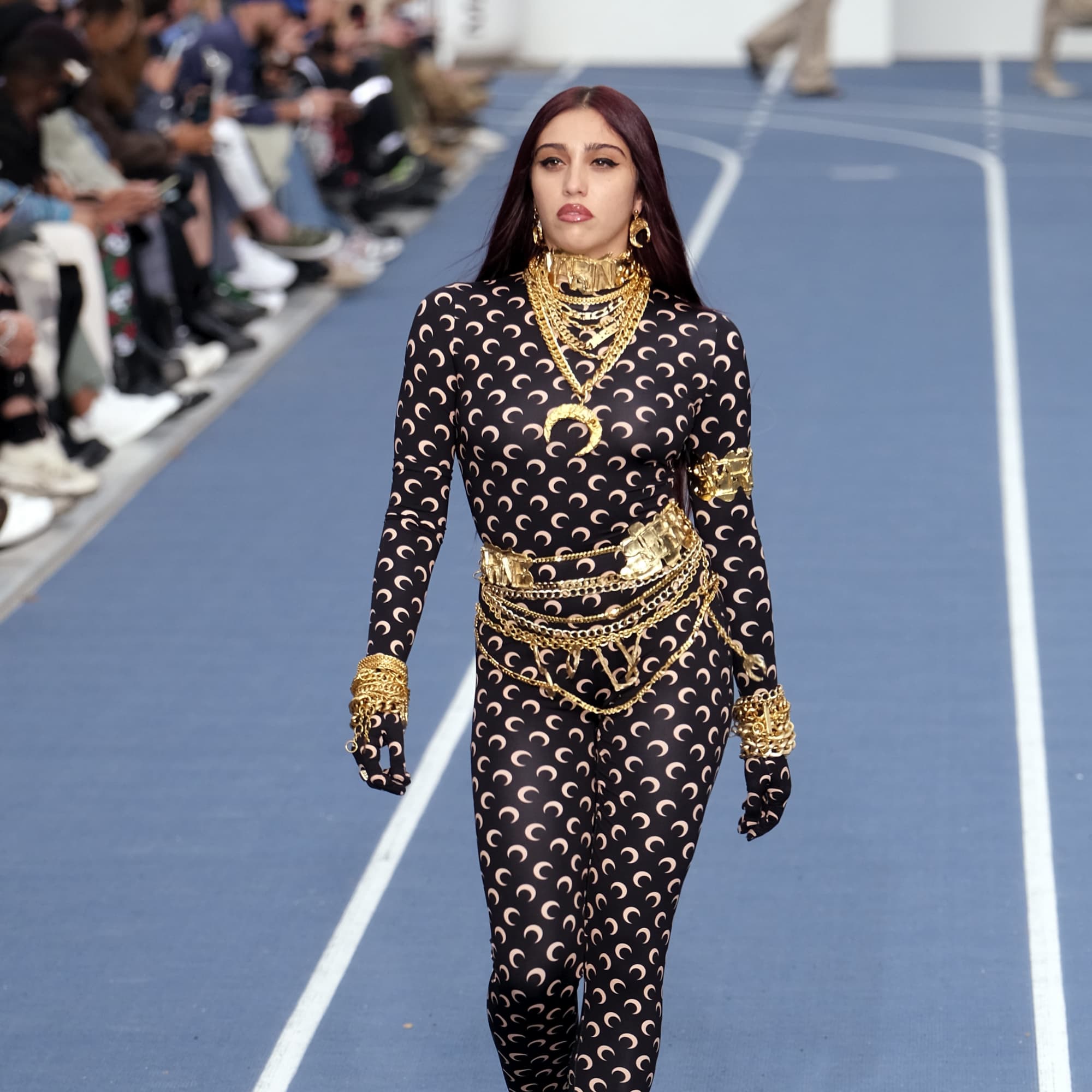On the Marine Serre runway in Paris on Saturday, June 25, Madonna‘s oldest daughter Lourdes Leon solidified her place as a model to watch. The 25-year-old star strutted down the catwalk in a catsuit imprinted with the brand’s signature crescent moon motif from head to toe. In line with the pantaleggings trend ushered in by Balenciaga, the design incorporated both pants and shoes seamlessly enmeshed with the same print and came with built-in gloves.