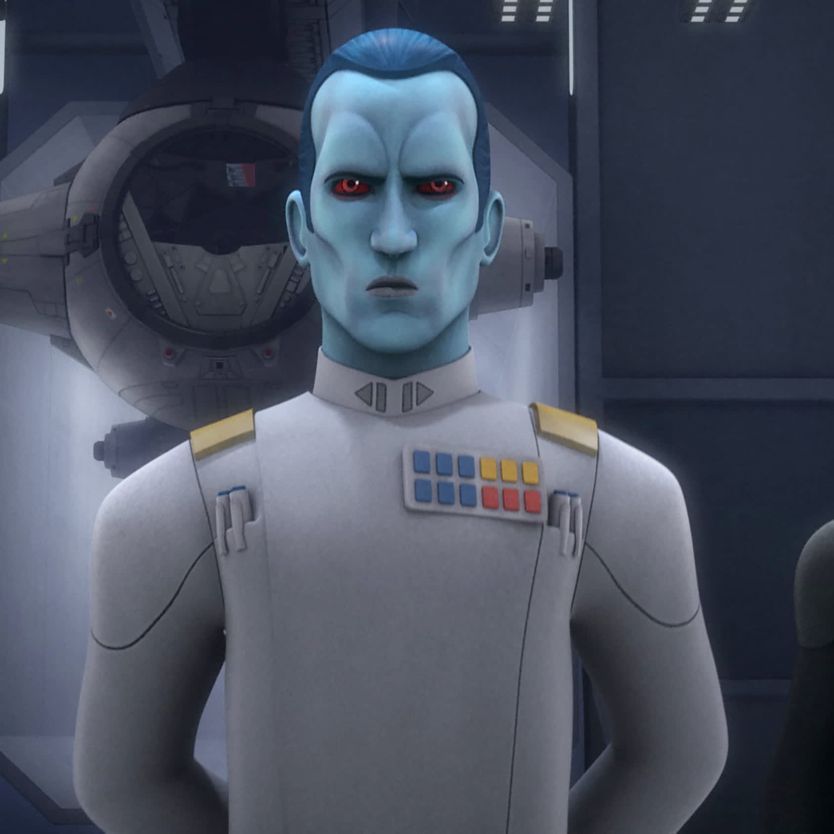 Thrawn is best known for being one of the biggest bads on Star Wars Rebels, the animated series that takes place during the Rebellion era, about five years before the original Star Wars trilogy picks up. His backstory is also covered extensively in a series of canonical novels. In brief, he’s a member of the alien race Chiss, a ruthless Imperial officer who became one of the most powerful men in the fleet. During the era of the Rebellion, he came into direct conflict with the Rebel cell led by Hera Syndulla, which also included Ezra Bridger, a young Jedi, and Sabine Wren, a Mandalorian.