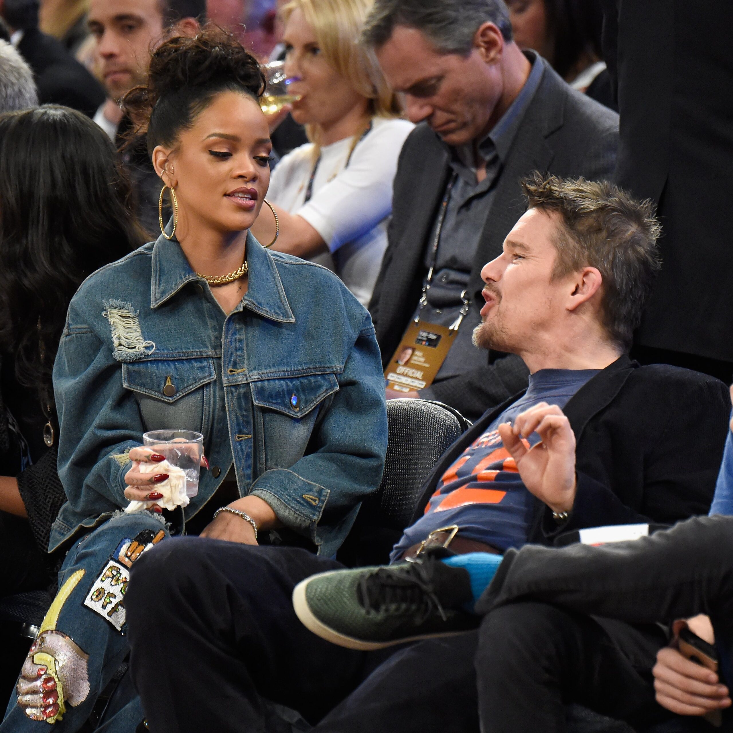 In paparazzi photos from the game, Ethan is seen reclining in his seat while he and Rihanna have a seemingly impassioned discussion. It’s unclear what the pair talked about, but it must have been interesting considering Ethan swapped seats with Levon to have a one-on-one chat with the Grammy winner.