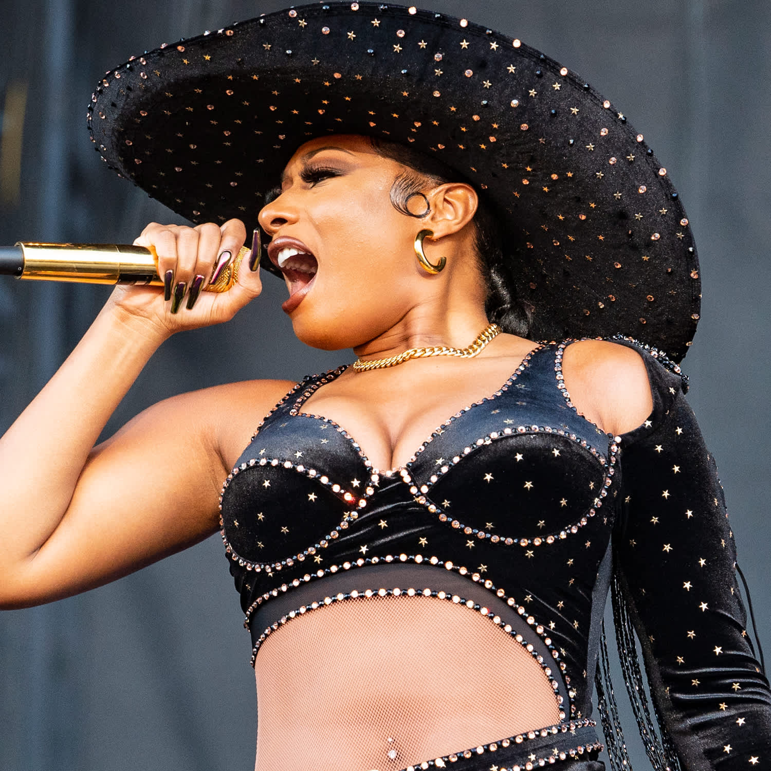 Megan Thee Stallion may not have a horse, but she’s riding into October in style. During a performance at Austin City Limits Music Festival on Oct. 8, Megan took the stage in an asymmetrical rhinestone bodysuit that puts a 2021 twist on classic cowboy fashion. On her right, the plunging one-piece included a strap down her thigh to hold her single chap in place, and on her left, the outfit extended into a single fringe-covered sleeve that flowed behind her like a cape in the wind. The velvet and mesh bodysuit even included a built-in belt buckle and came with a matching, extra wide-brimmed hat that reflected all the shimmer and shine coming off the “WAP” singer.
