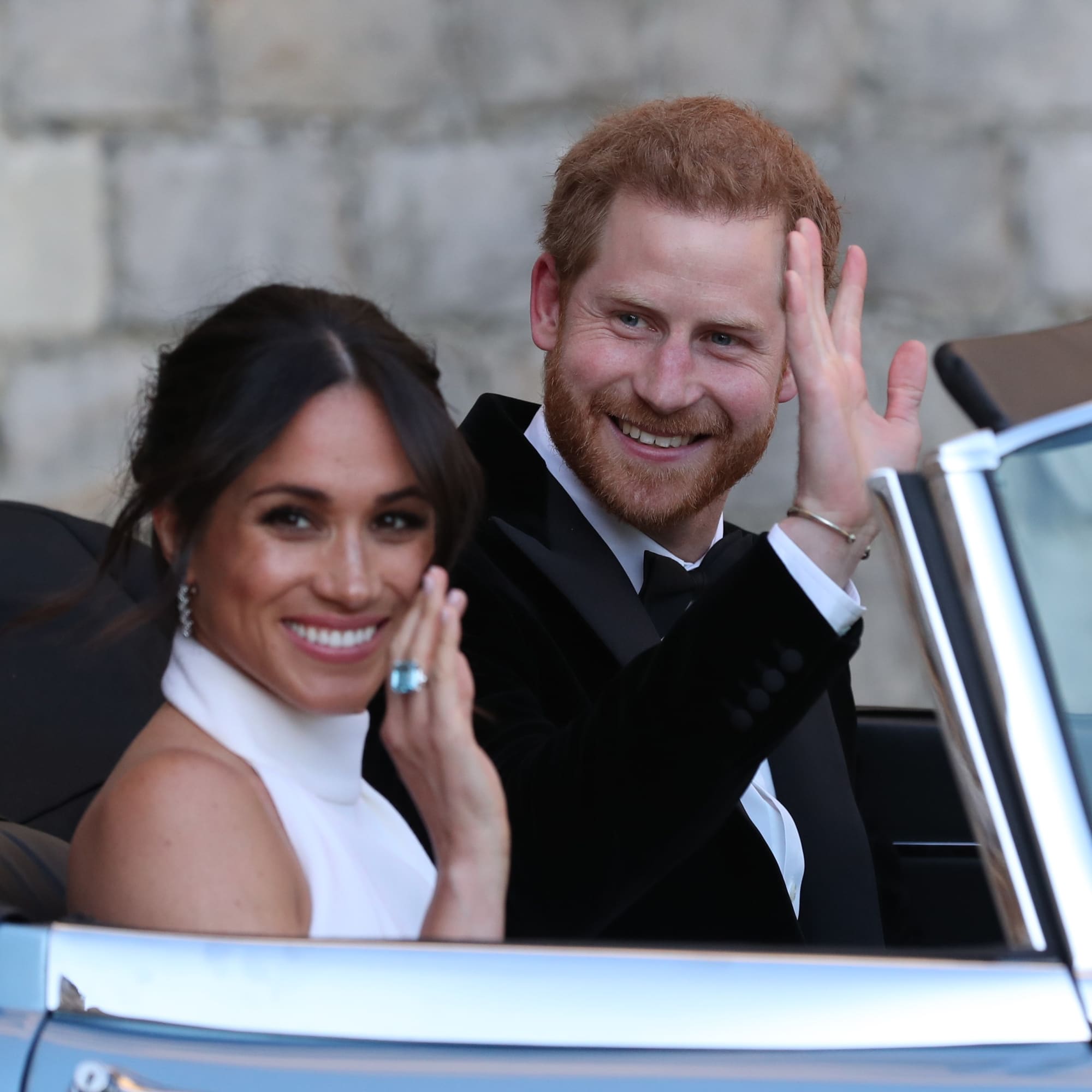 After her wedding in 2018, Meghan Markle drove off with Prince Harry to her evening reception at Frogmore House in a blue Jaguar. The gorgeous couple were glowing, but that was in part thanks to Meghan’s flashy bauble: a baby-blue, square Asprey gemstone that glowed from her right ring finger and belonged to Princess Diana. (Princess Diana wore the same aquamarine ring at a public outing in October 1996, a benefit dinner in Australia.) Was this her “something blue” and something borrowed? It certainly appears that way.