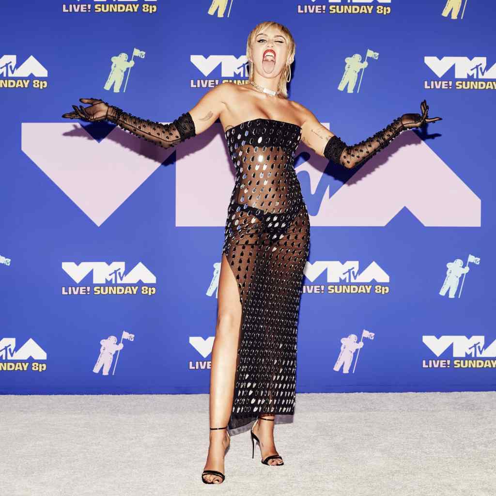 Let’s give Miley Cyrus a round of applause because she definitely *brought it* at the 2020 MTV VMAs. The singer, who is performing “Midnight Sky,” stunned in a sparkly black Mugler dress that was completely sheer. (No shocker there since she’s the queen of daring MTV VMAs red carpet looks.) She paired the see-through dress with matching black underwear, and the strapless number was covered with tiny silver mirrored embellishments that reflected with the camera flashes.
