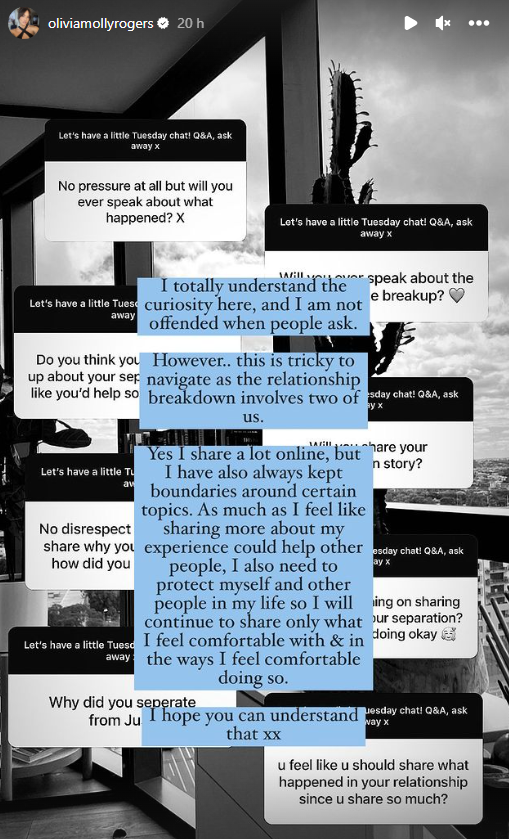 At the time, Olivia said she had “made the difficult decision to separate as a couple”, but shared no reasoning behind it. And now, even months following the shock news, the model re-posted to her Instagram stories how many questions she’s still being inundated with about it now.