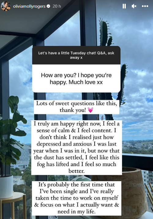 The pair called it quits just eight months after they wed and Olivia has remained tight-lipped over why her marriage ended. But while hosting an Instagram Q&A on Tuesday, she opened up about the impact the split has had on her mental health.