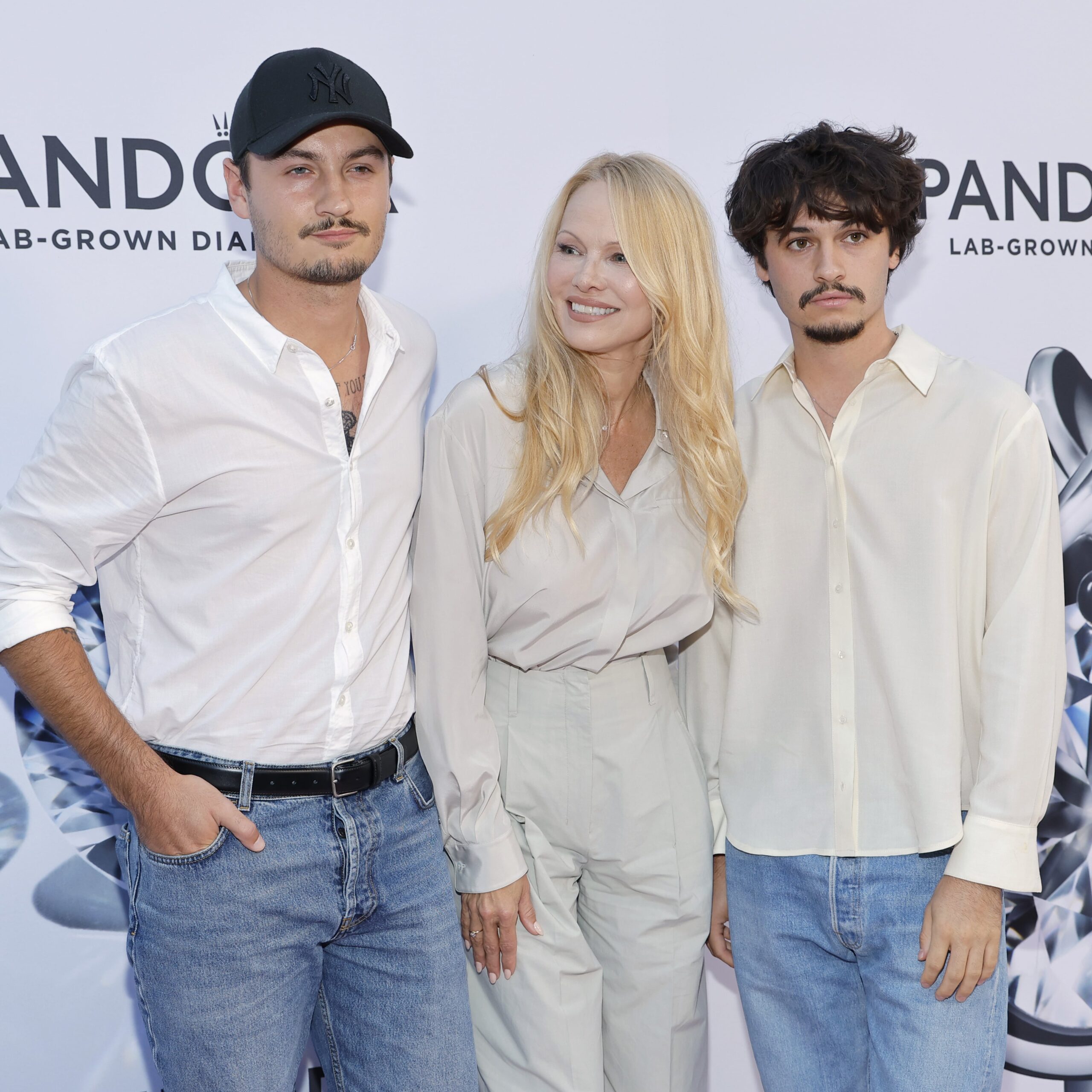 Pamela Anderson is a gem. During the Pandora Lab Grown Diamonds event for New York Fashion Week on Sept. 6, the actor and author stepped out with her two sons – 25-year-old Dylan Lee and 27-year-old Brandon Lee – for a joint red carpet appearance. The family appeared to coordinate outfits, with the boys wearing similar white button-down shirts and blue jeans, and Anderson matching in an all white ensemble. As the new (makeup-free) face of Pandora’s lab-grown diamonds, this moment marked a major milestone for what Anderson described as her “new chapter” – a deliberate shift away from her former bombshell image. She stars in the campaign alongside her sons and other icons like Precious Lee and Justina Miles.
