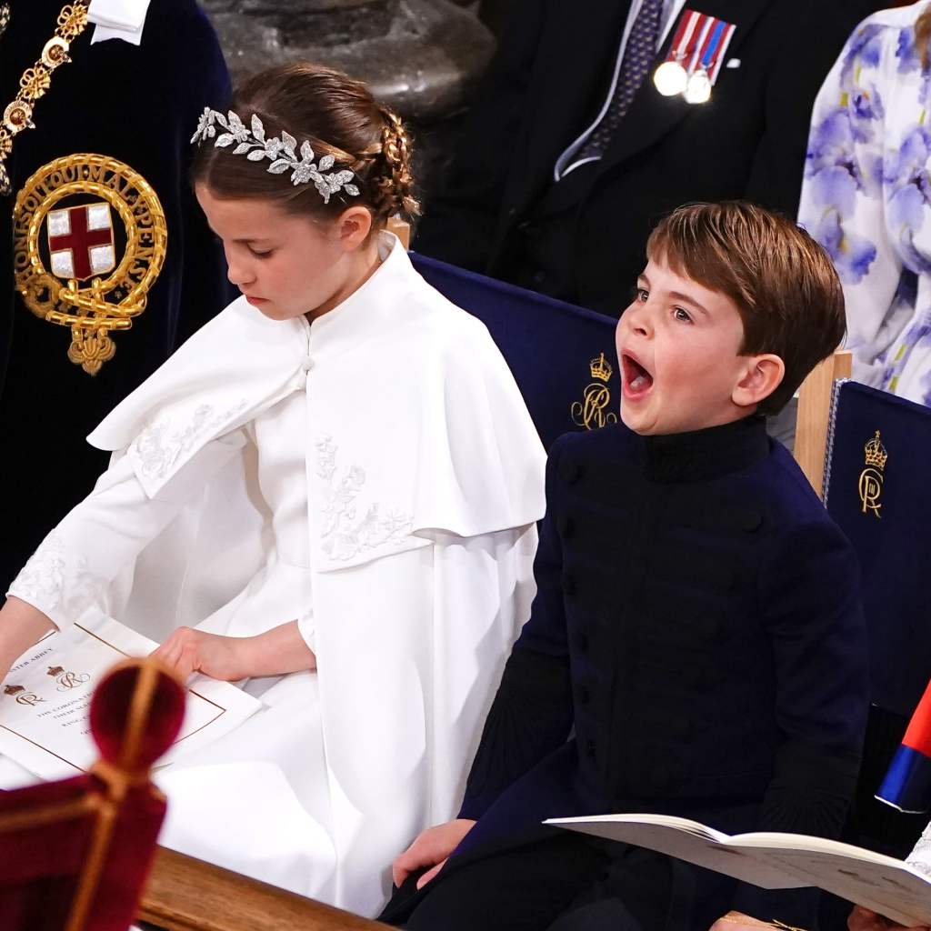 Wearing a smart navy blue suit, the little boy was seen letting out several yawns, staring up at the ceiling, and chatting with his sister Charlotte during the event. Frankly, he looked quite bored by the festivities, sitting between mom Princess Kate and his 8-year-old sister. It appears Louis left for the second half of the service, ahead of the carriage procession to Buckingham Palace. Middleton and Prince William’s oldest son, 9-year-old George, served as one of the king’s pages of honor, while Charlotte and Louis walked into Westminster Abbey with their parents.